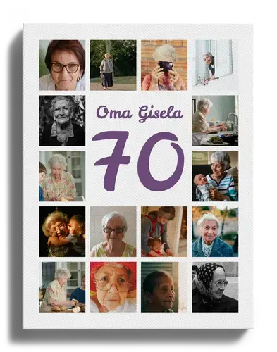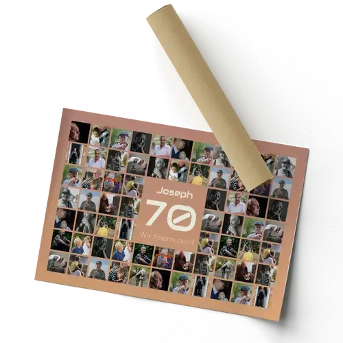 Gestalte jetzt deine Jubiläums-Zahlen-Collage 70! Im Mittelpunkt steht eine große 70, darüber der Name und darunter ein Grußtext, umrahmt von 20–80 deiner Fotos in einem klaren Raster. Zahl, Name, Worte, Bildanzahl, Hintergrund und Farben sind frei wählbar, ebenso Hoch- oder Querformat – perfekt zum 70. Geburtstag, zur Gnadenhochzeit oder zum 70-jährigen Firmenjubiläum.