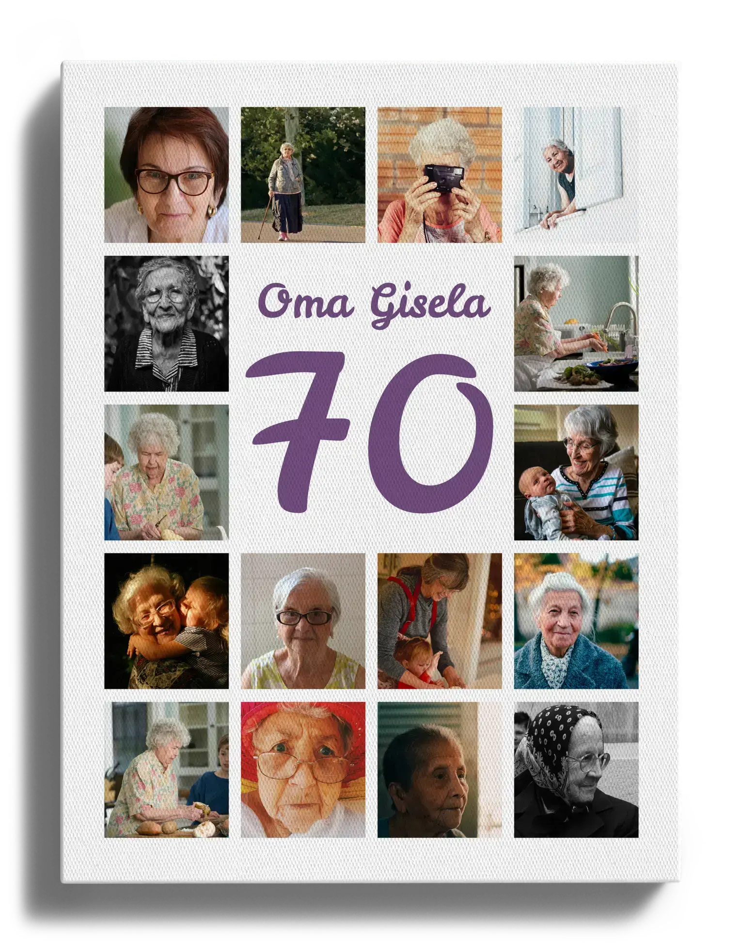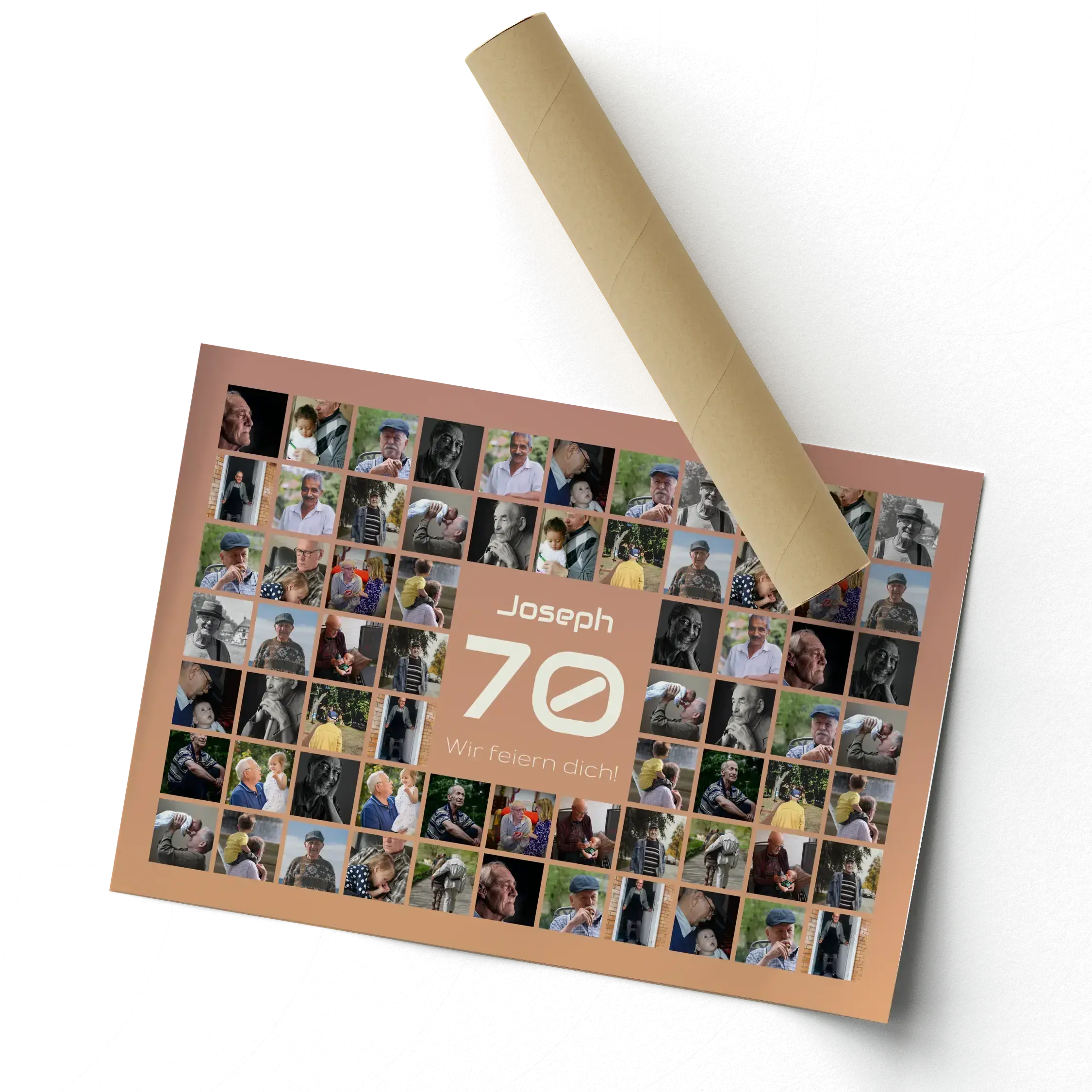 Zahl-Collage 70 – mit Name, Gruß & 20–80 Fotos im Raster. Für 70. Geburtstag oder Firmenjubiläum.