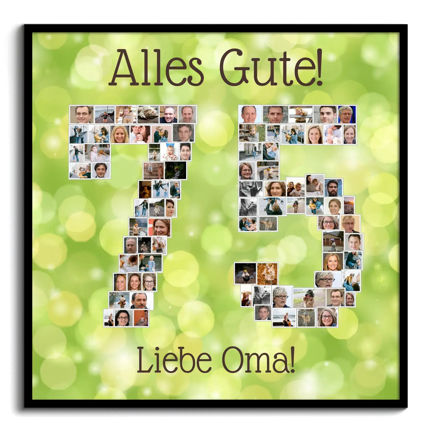 Erstelle jetzt dein persönliches Geschenk. Beispiel: Eine individuelle Collage in der Zahl 75 für Oma, auf einem frischen, fetzigen Grün. Viele kleine Fotos formen die Jubiläumszahl, ergänzt durch den Spruch Alles Gute, liebe Oma. Perfekt als liebevolle Überraschung von der Familie und als Hingucker auf der Geburtstagsfeier.