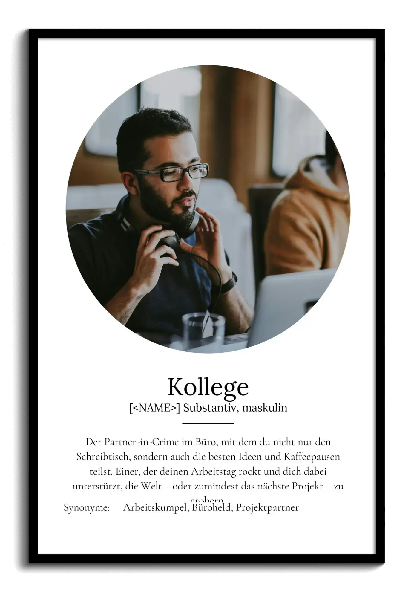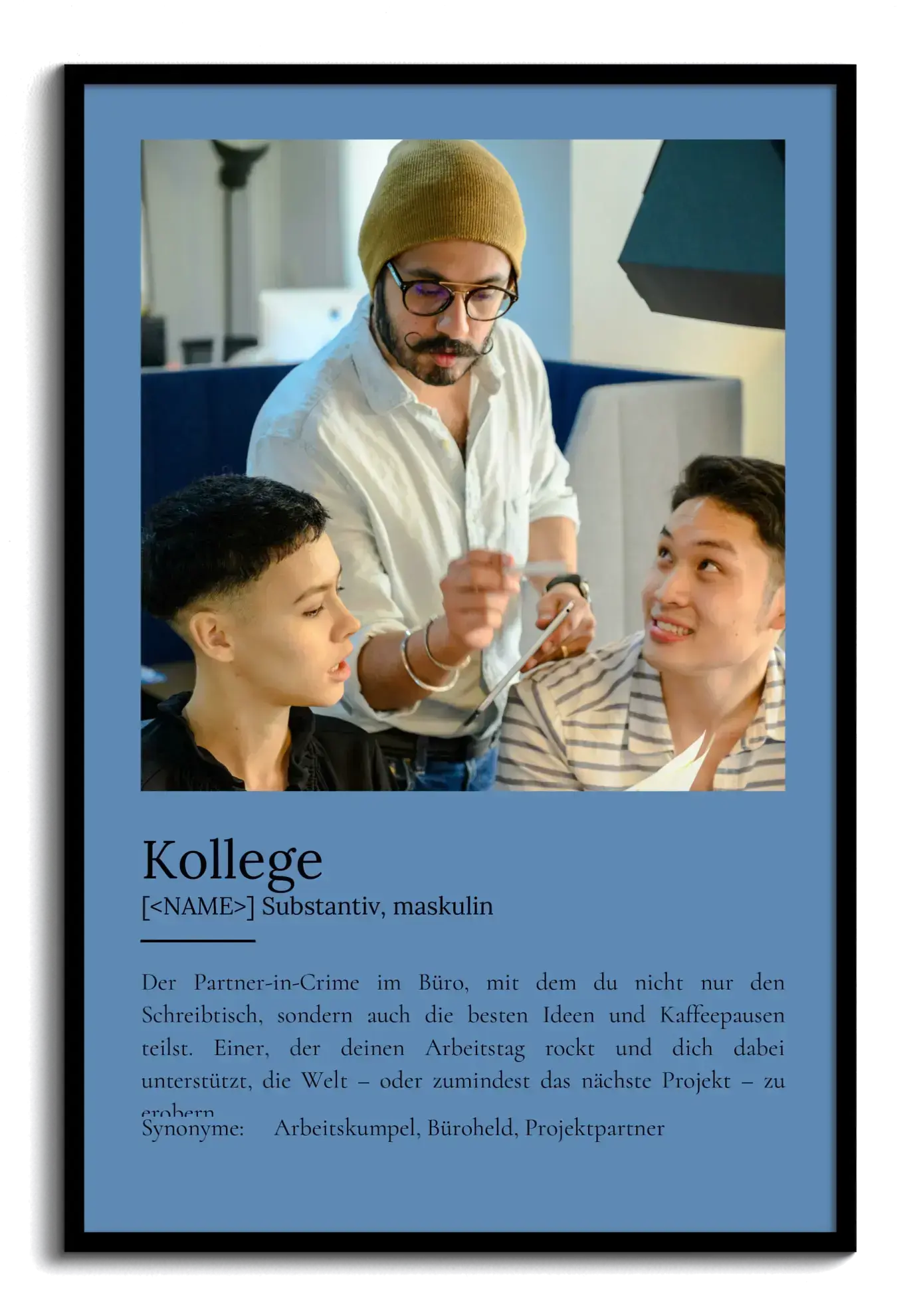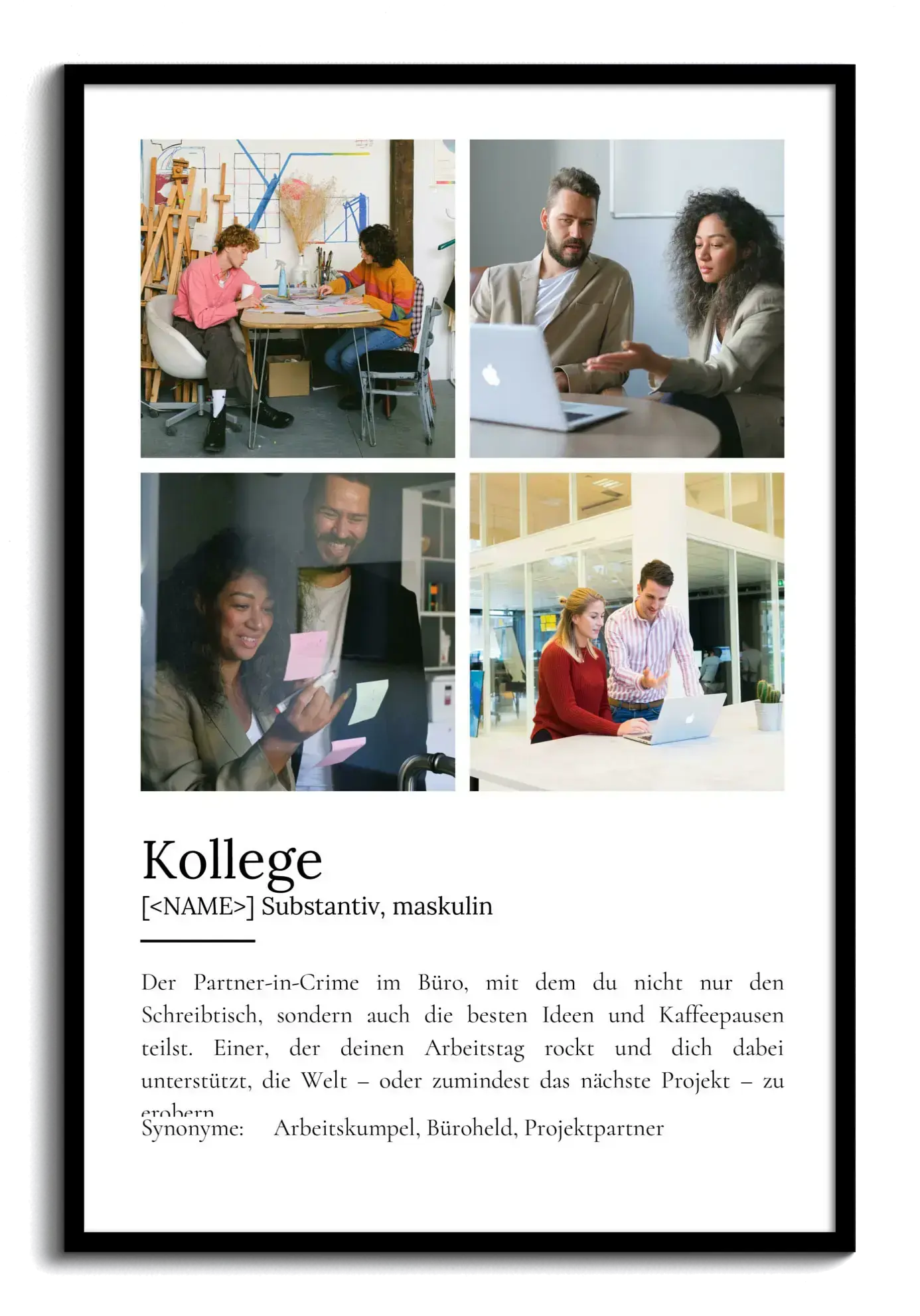 Gestalte dein personalisiertes Definitionsposter im Duden-Stil für deinen Lieblingskollegen und mache ihm ein unvergessliches Geschenk. Ein Poster, das beeindruckt: 'Kollege – Der Partner-in-Crime im Büro, der deinen Arbeitstag rockt.'