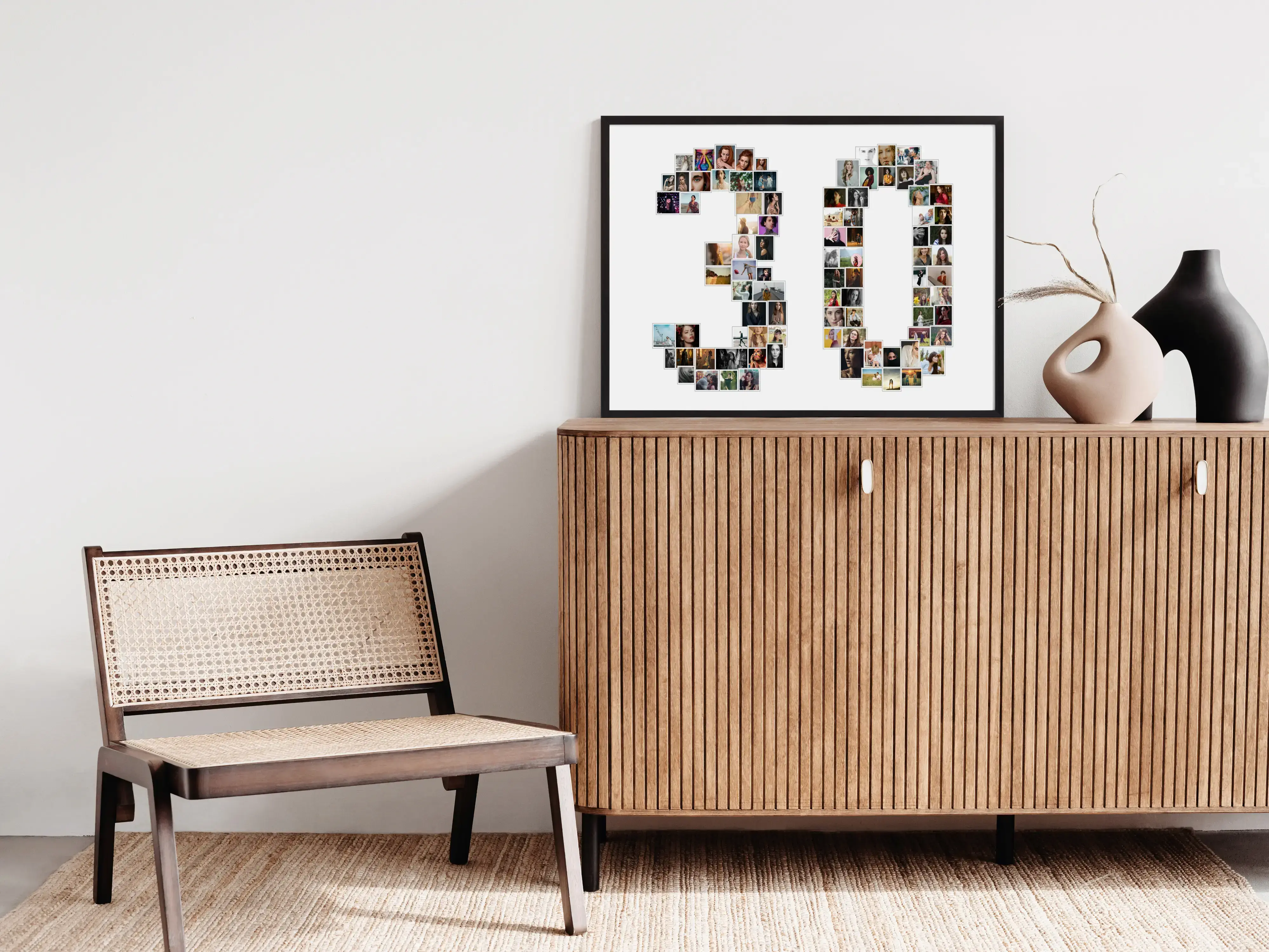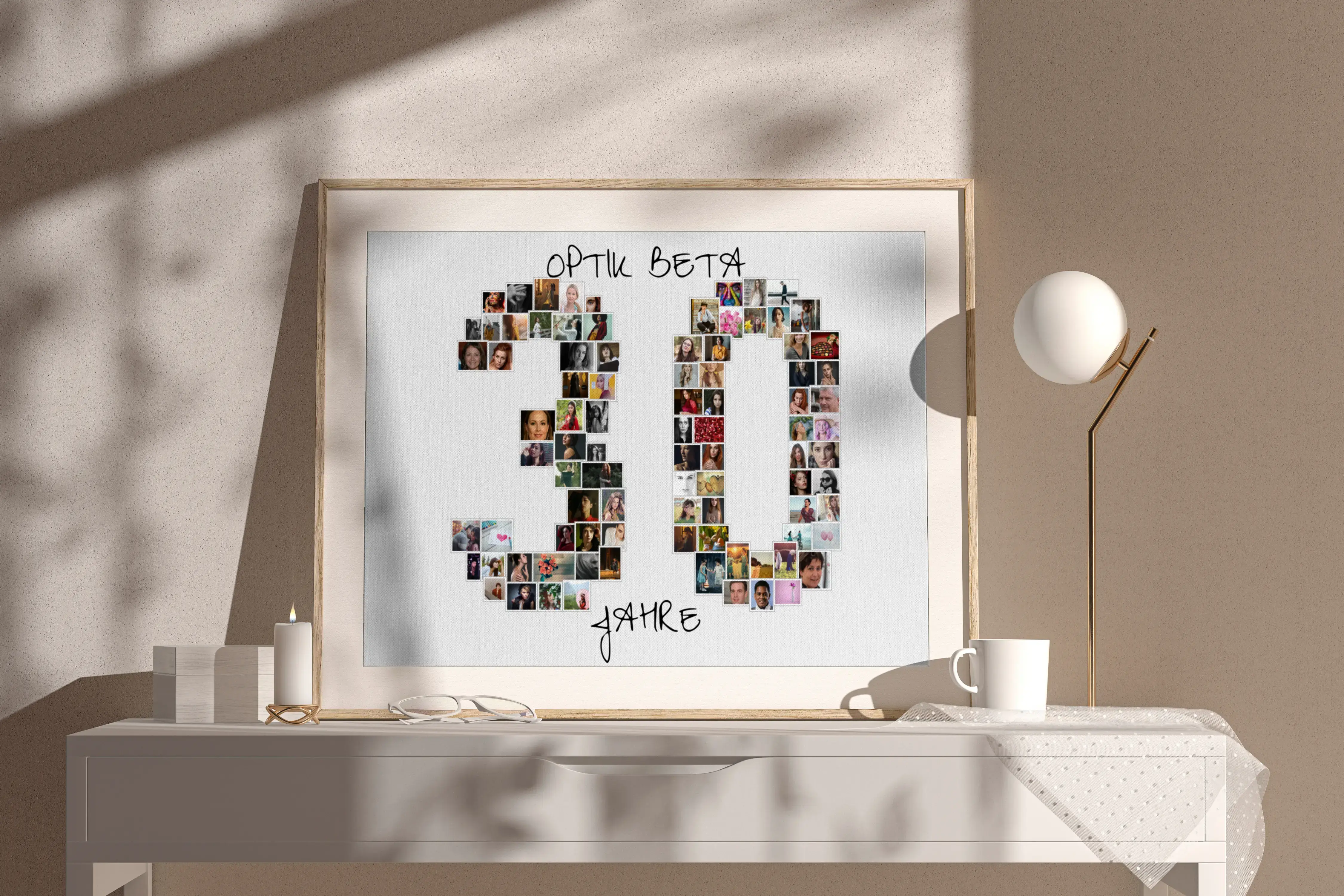 Erfasse den Zauber deines Lebens mit einer persönlichen Fotocollage. Unsere '30er' Zahlencollage ist ein perfekter Hingucker, erstellt aus bis zu 100 deiner Lieblingsfotos. Ein tolles Geschenk, das festgehaltene Momente auf einzigartige Weise präsentiert.