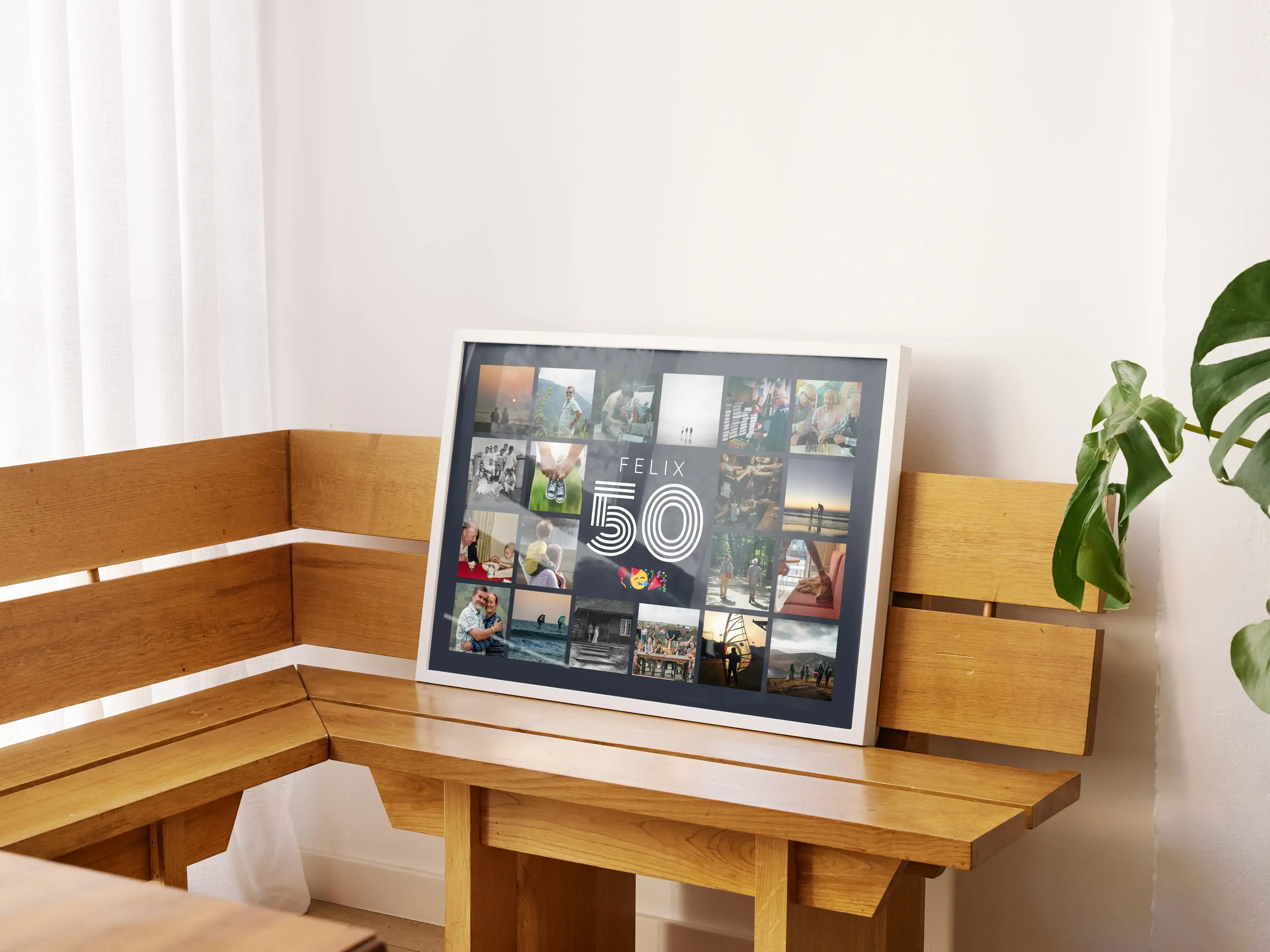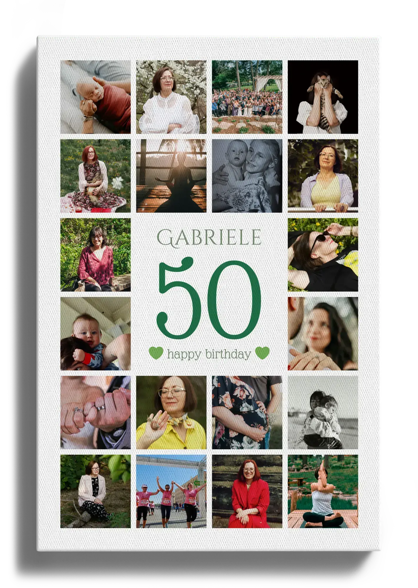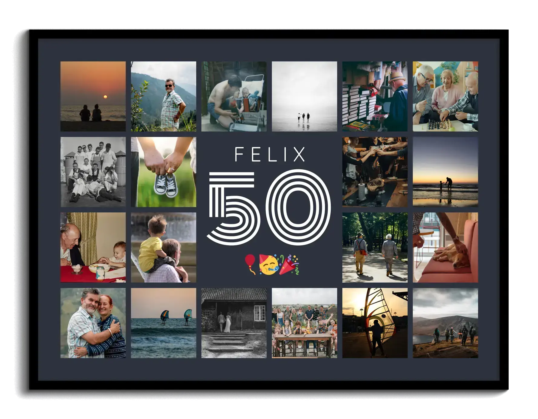 Jetzt personalisieren und als hochwertigen Kunstdruck bestellen. Die Jubiläums-Zahl Collage 50 setzt eine große 50 in die Mitte, oben steht der Name, unten dein Grußtext. Rundherum platzierst du 20–80 Lieblingsfotos im Raster. Zahl, Name, Text, Bildanzahl, Hintergrund, Farben sowie Hoch- oder Querformat sind frei wählbar.