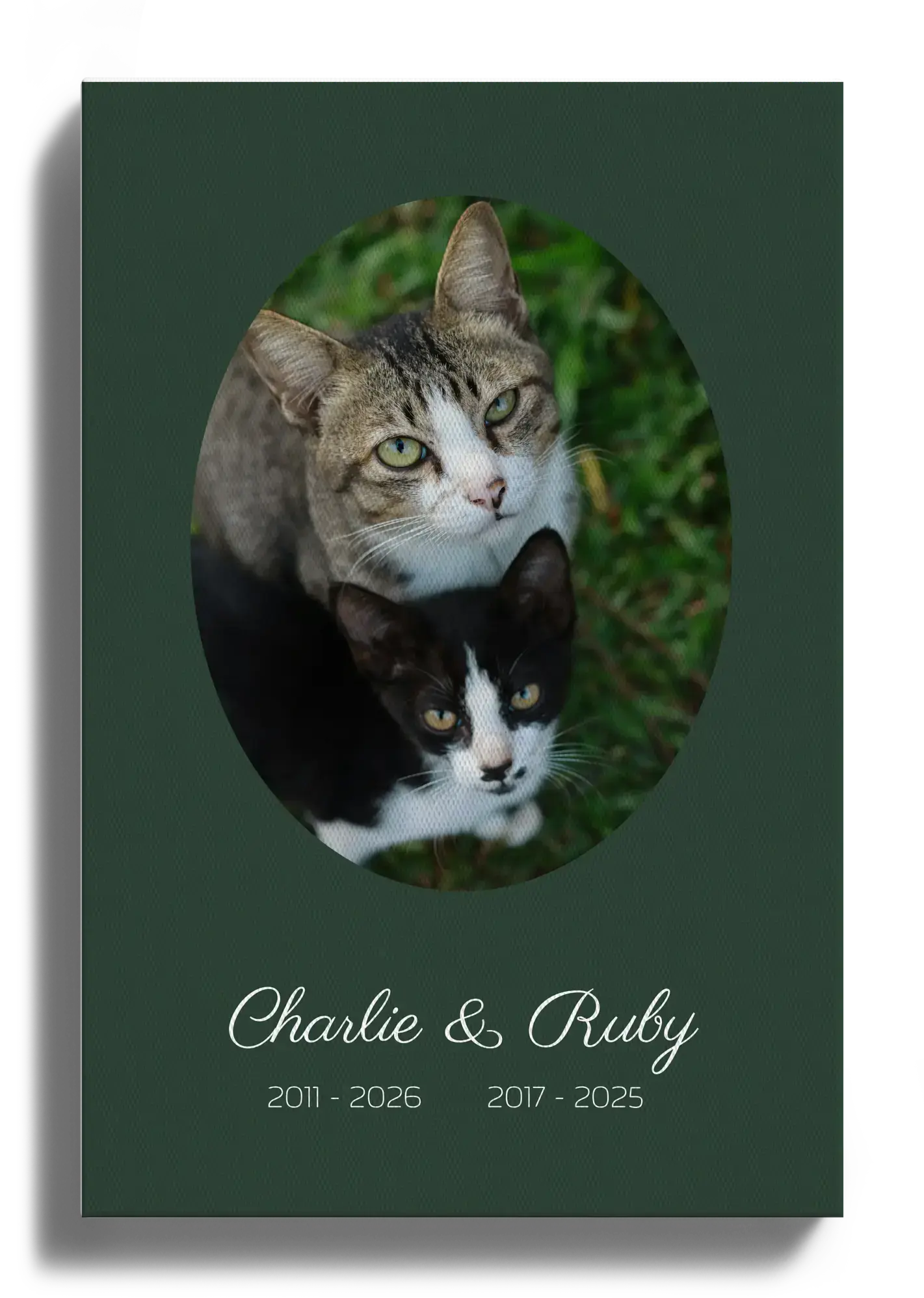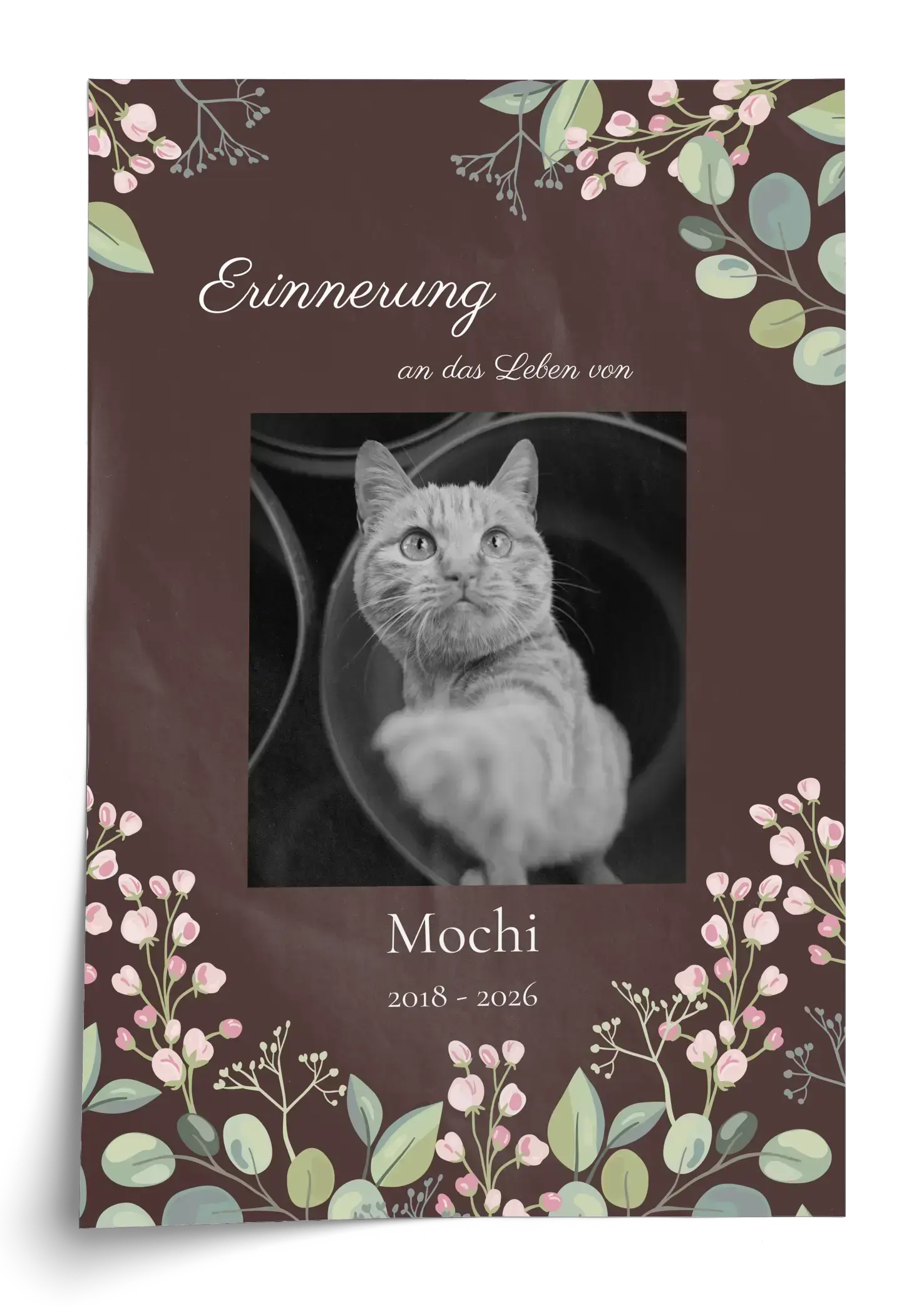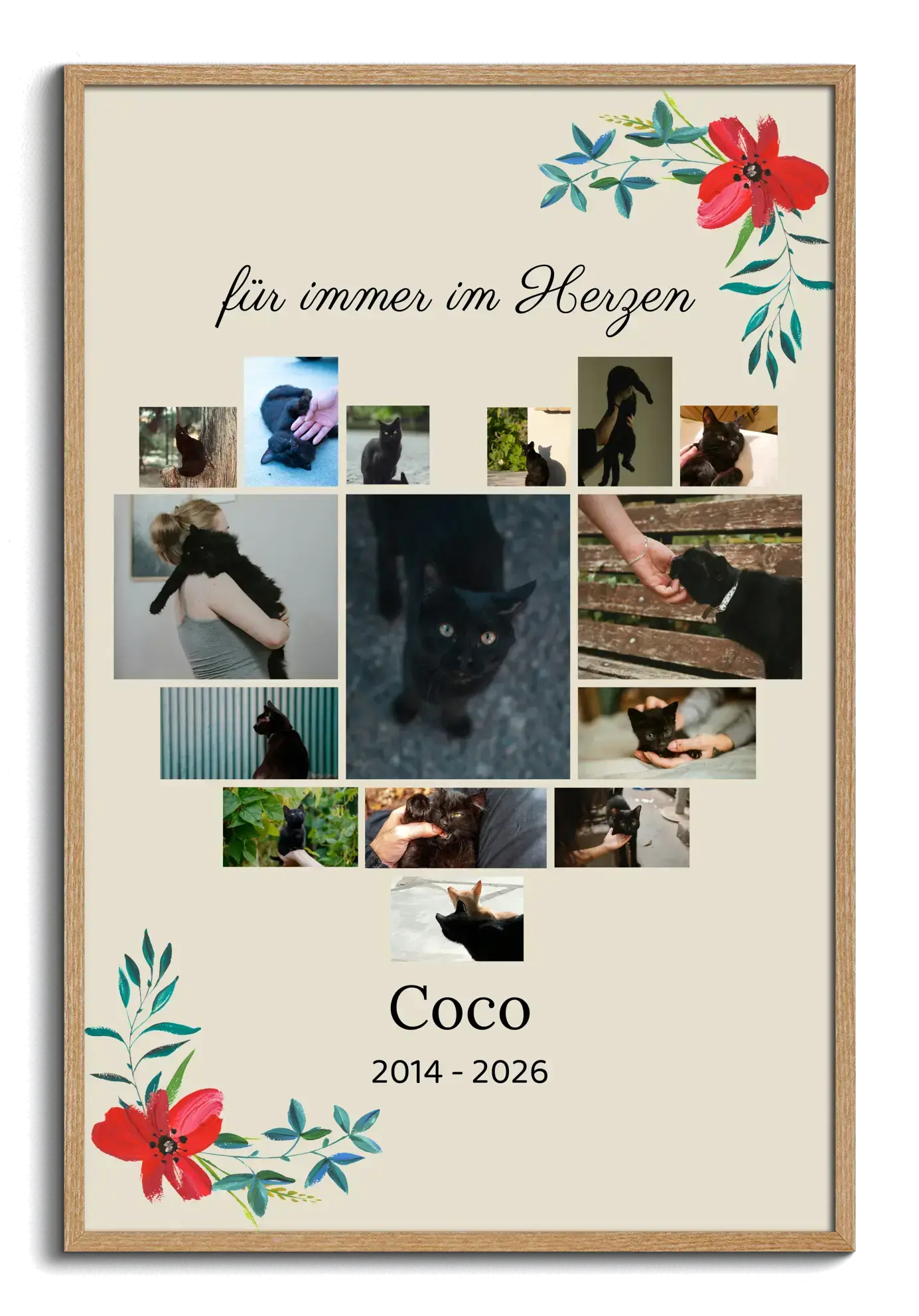 Gefühlvolle Gedenk-Collage für Katzen: großes Foto, Textbalken für Name & Daten, optionaler Spruch.