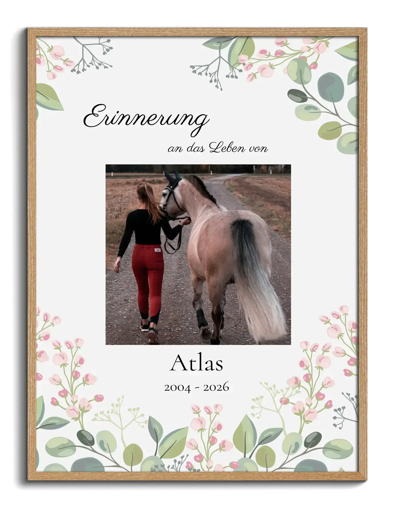 Gestalte dein Gedenkposter fürs Pferd mit Foto, Name & Lebensdaten – würdevoll