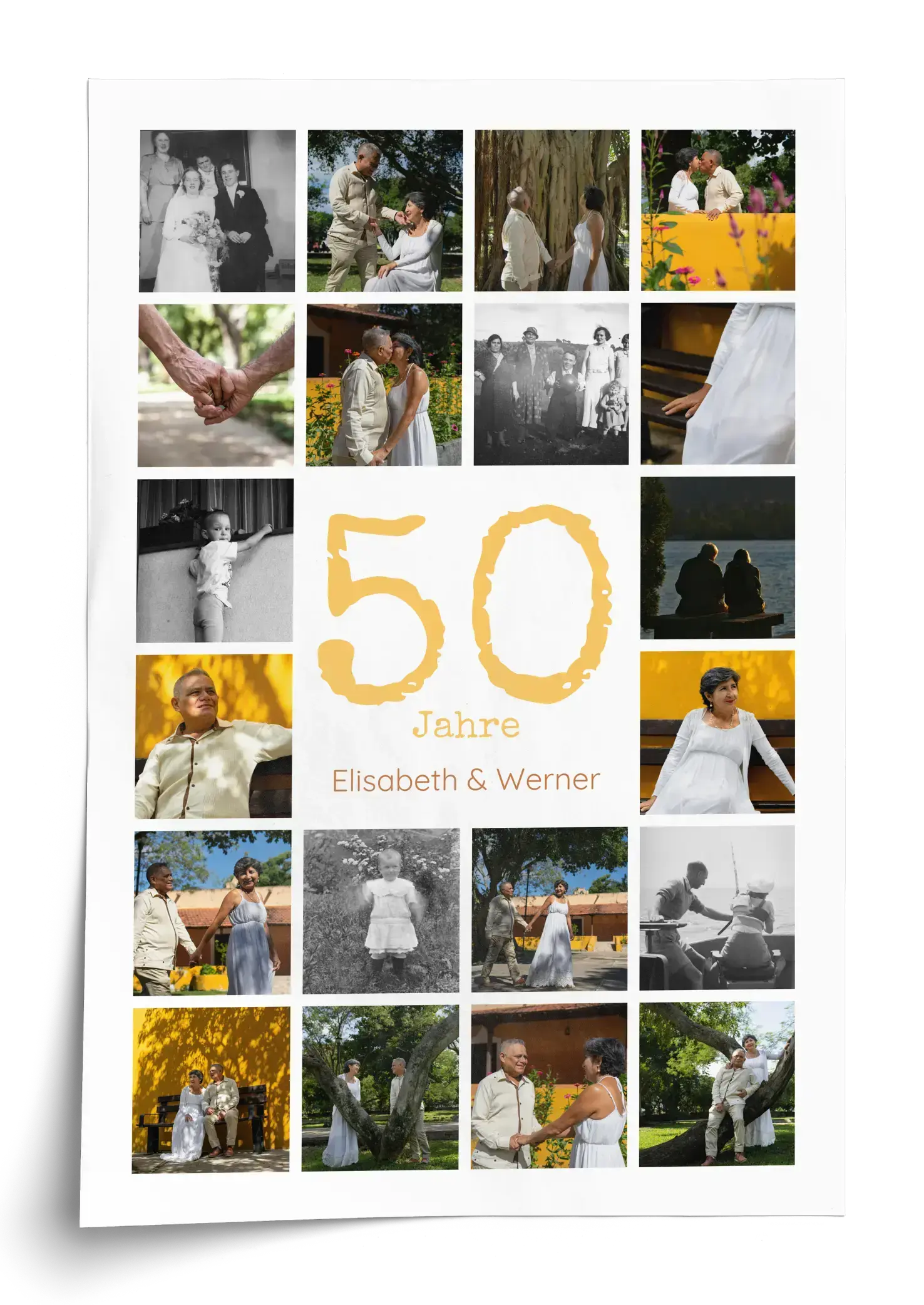 Goldene Hochzeit als Jubiläums-Zahl-Collage: große Zahl, Namen & Text, 20–80 Fotos, anpassbar