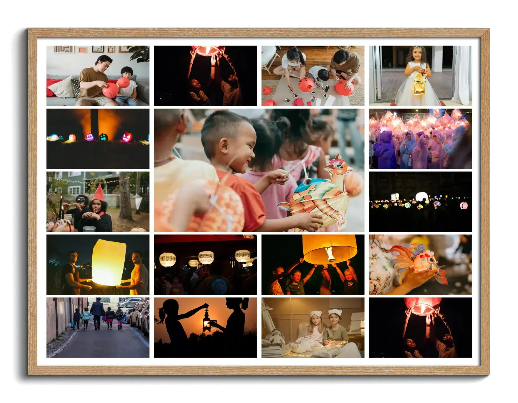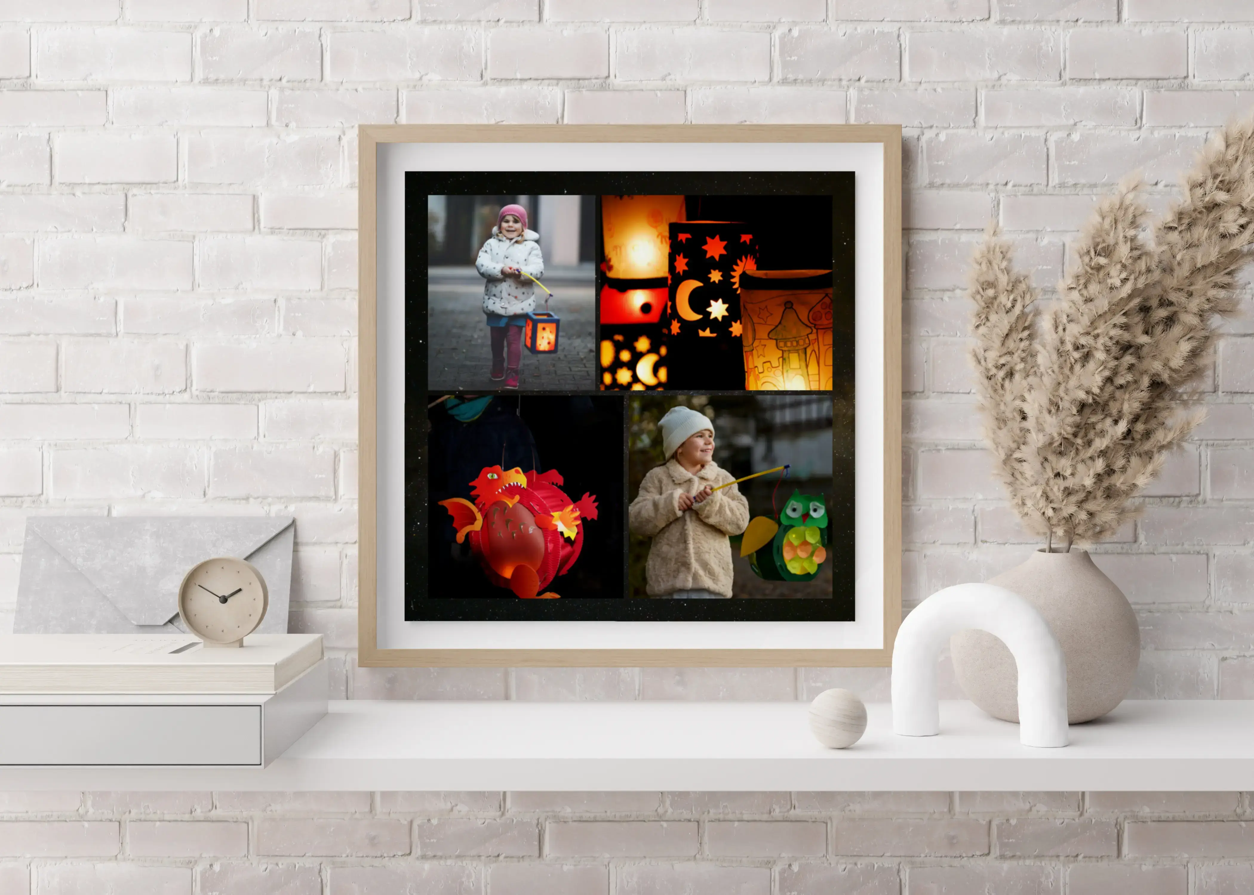 Jetzt gestalten und sofort bestellen: Dein herbstlicher Laternenzauber als personalisierbarer Kunstdruck. Verewige den St.-Martin-Umzug – Kinder und Erwachsene mit großen und kleinen, bunt leuchtenden Laternen – in liebevoll arrangierten Vorlagen von Raster bis Herz. Füge Text wie Lichterzauber, Datum und Ort hinzu, wähle Anzahl der Bilder und Größe frei.