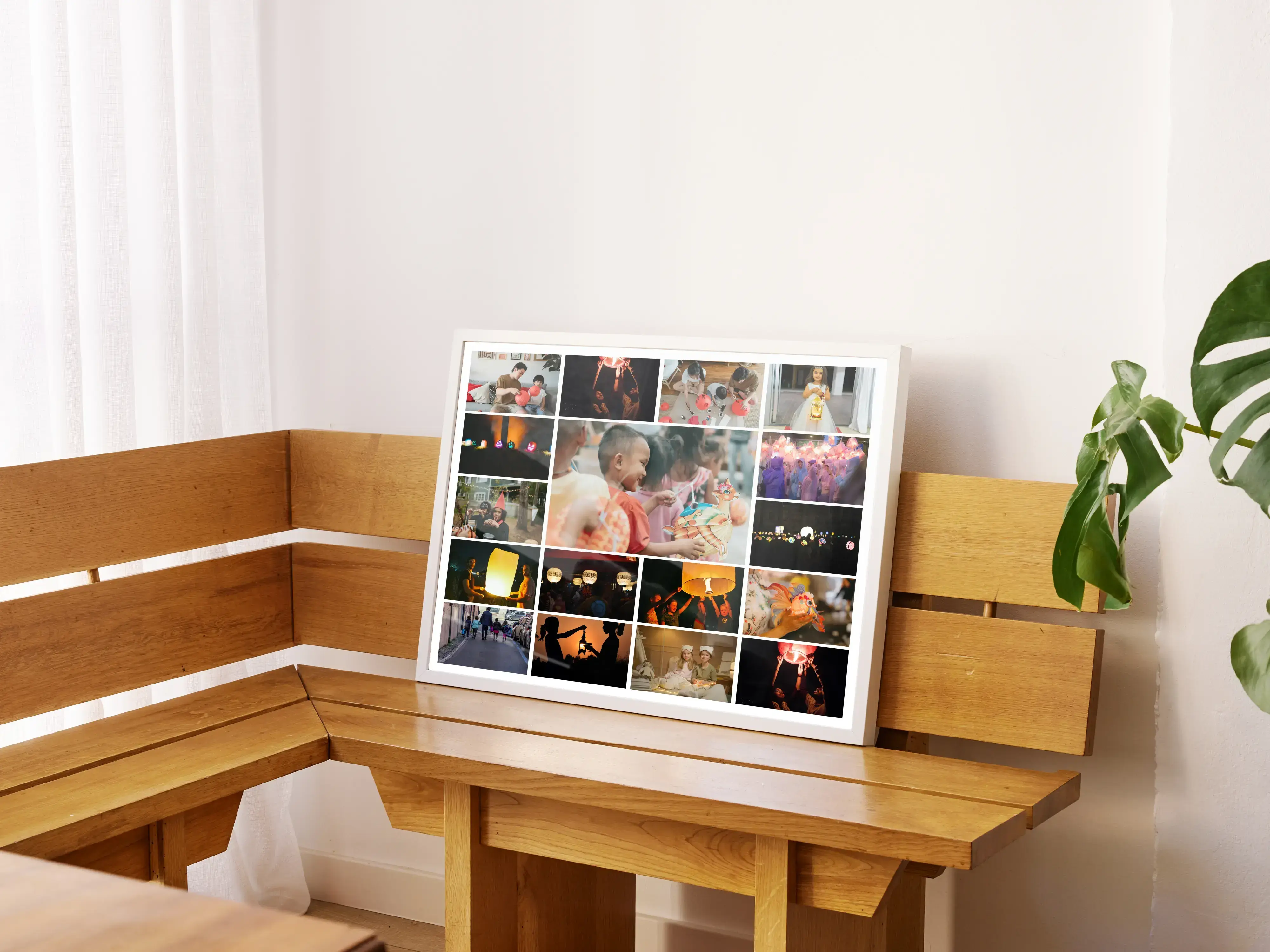 Gestalte frei: viele Vorlagen wie Raster, Herz, Text oder Zahlen, auf Wunsch im Polaroid-Stil mit Beschriftung. Passe Abstände, Ränder, Hintergründe und Effekte an, setze Überschriften, Namen und Daten, wähle Hoch-, Quer- oder Quadratformat und bestimme die Bildanzahl ganz nach deinen Motiven.