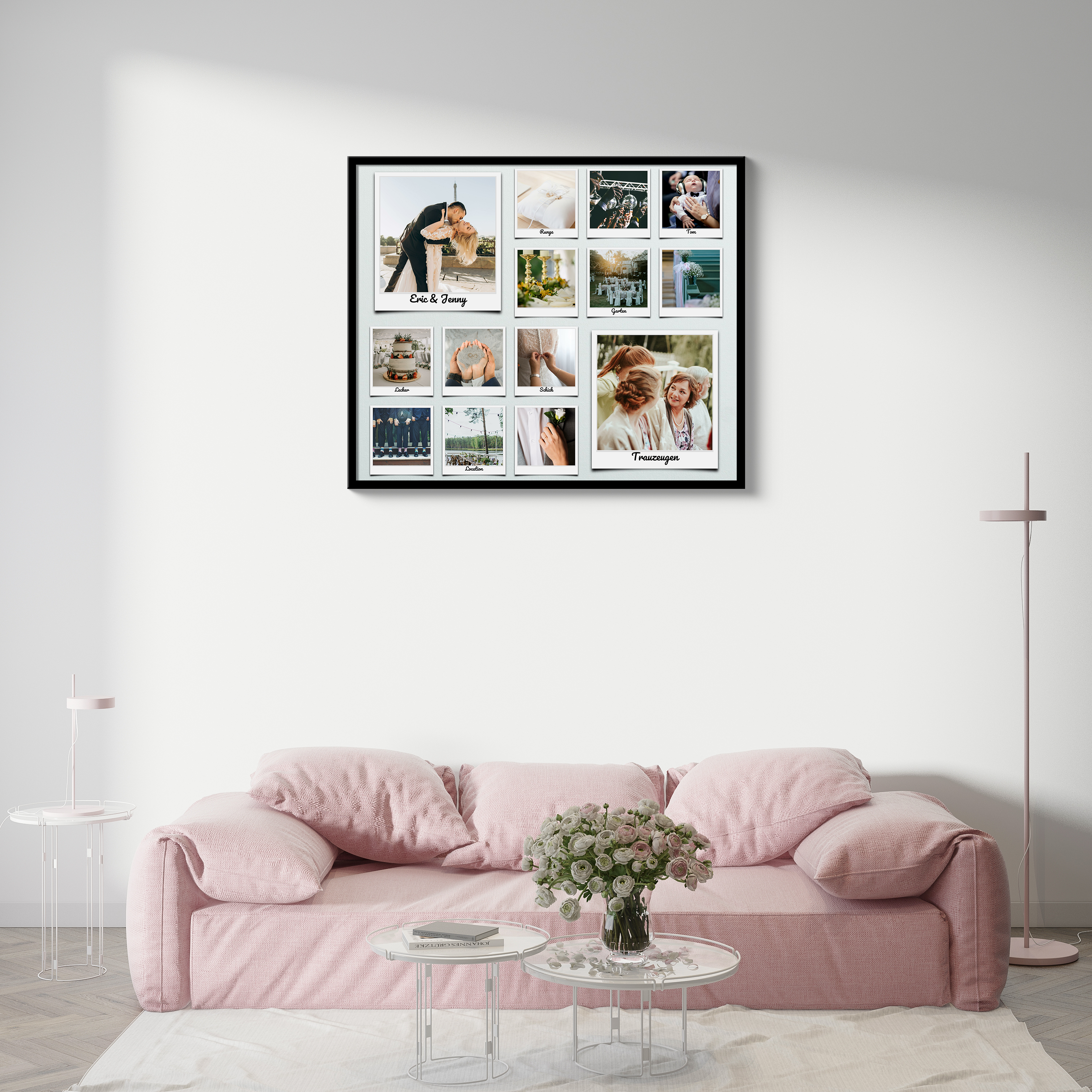Unsere Hochzeits-Fotocollage ist das perfekte Geschenk für frisch Vermählte oder das ideale Andenken für deinen großen Tag. Sie eignet sich auch hervorragend als Jahrestagsgeschenk oder als einzigartiges Dankeschön-Geschenk für deine Hochzeitsgäste oder Trauzeugen. Kreiere jetzt deine einzigartige Hochzeitserinnerung!