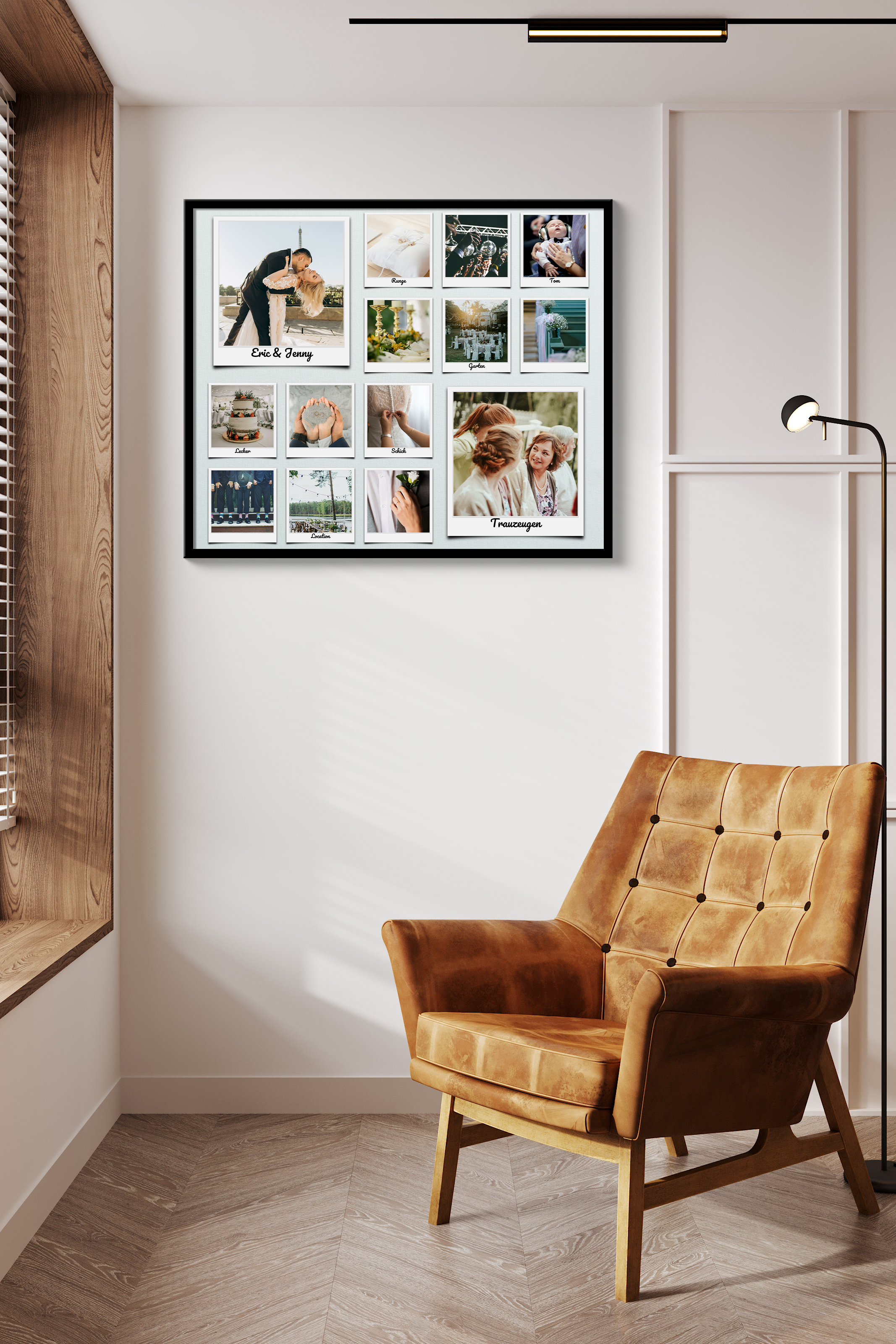 "Hochzeitscollage im Polaroidstil – Erinnerungsfotos perfekt in Szene gesetzt."