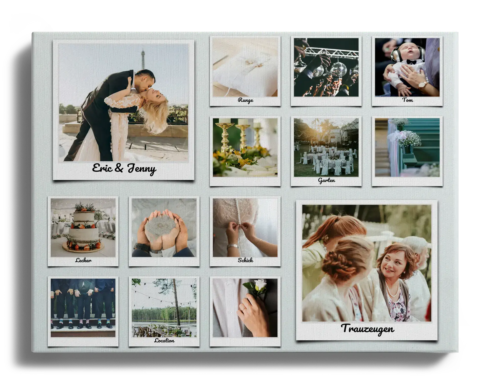 Deine Möglichkeiten sind endlos! Probiere verschiedene Anordnungen und Designs aus, wechsle Hintergründe und passe Texte an. Teste verschiedene Fotoanordnungen und probiere verschiedene Polaroidstile aus. Du kannst die Collage automatisch befüllen lassen oder die Platzierung der Fotos selbst bestimmen. Deine Hochzeits-Fotocollage kann genau so einzigartig sein wie dein großer Tag.