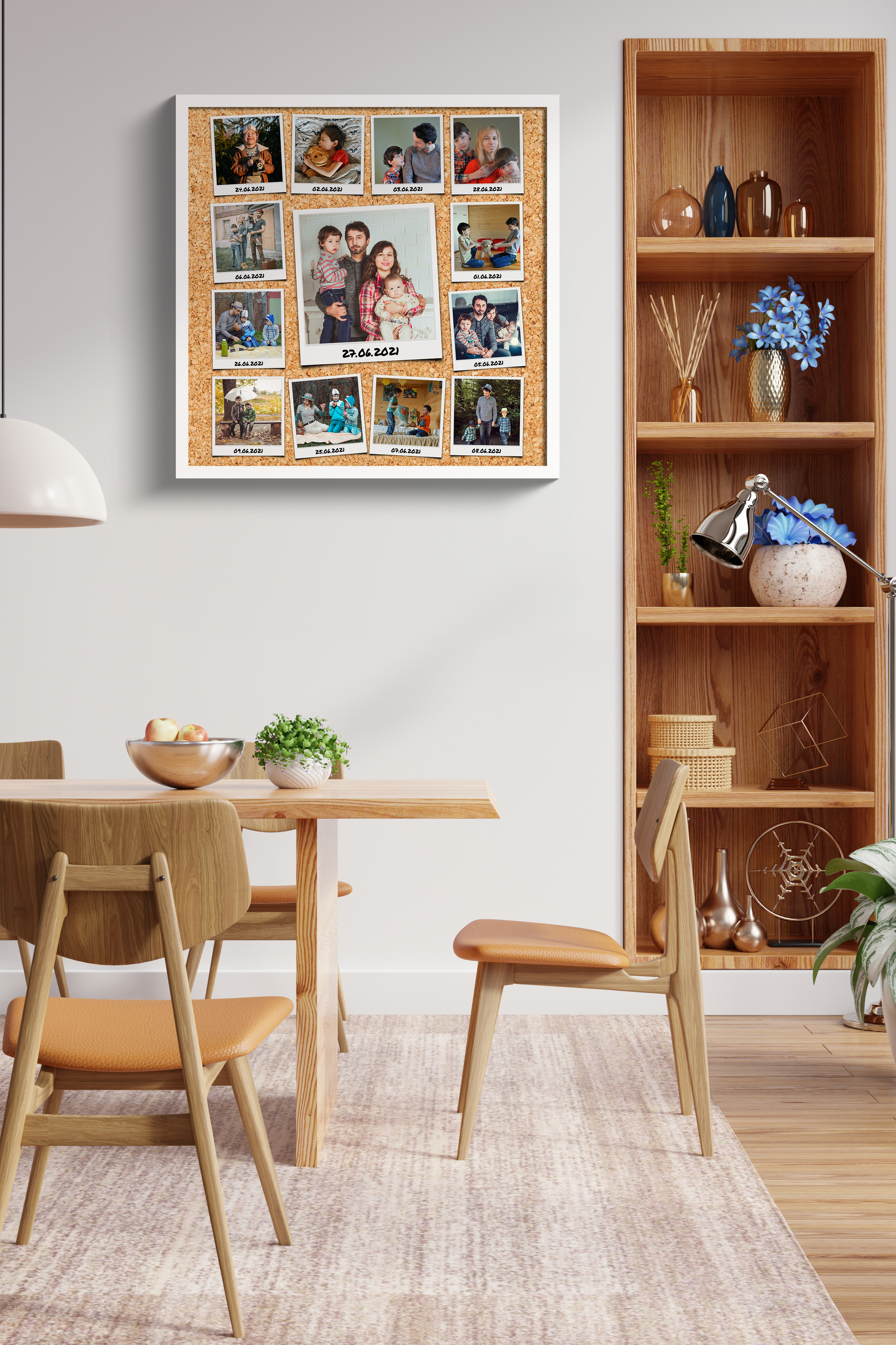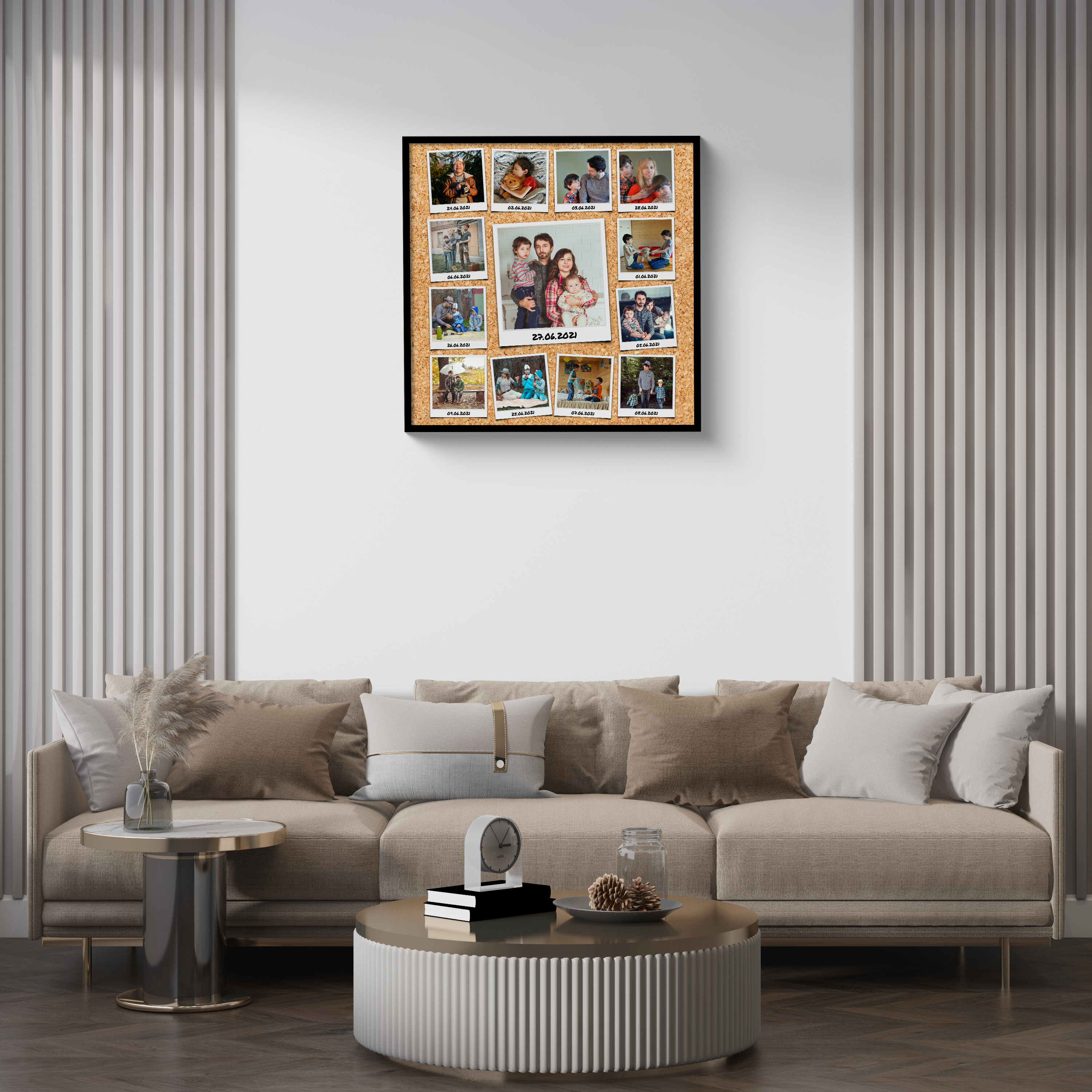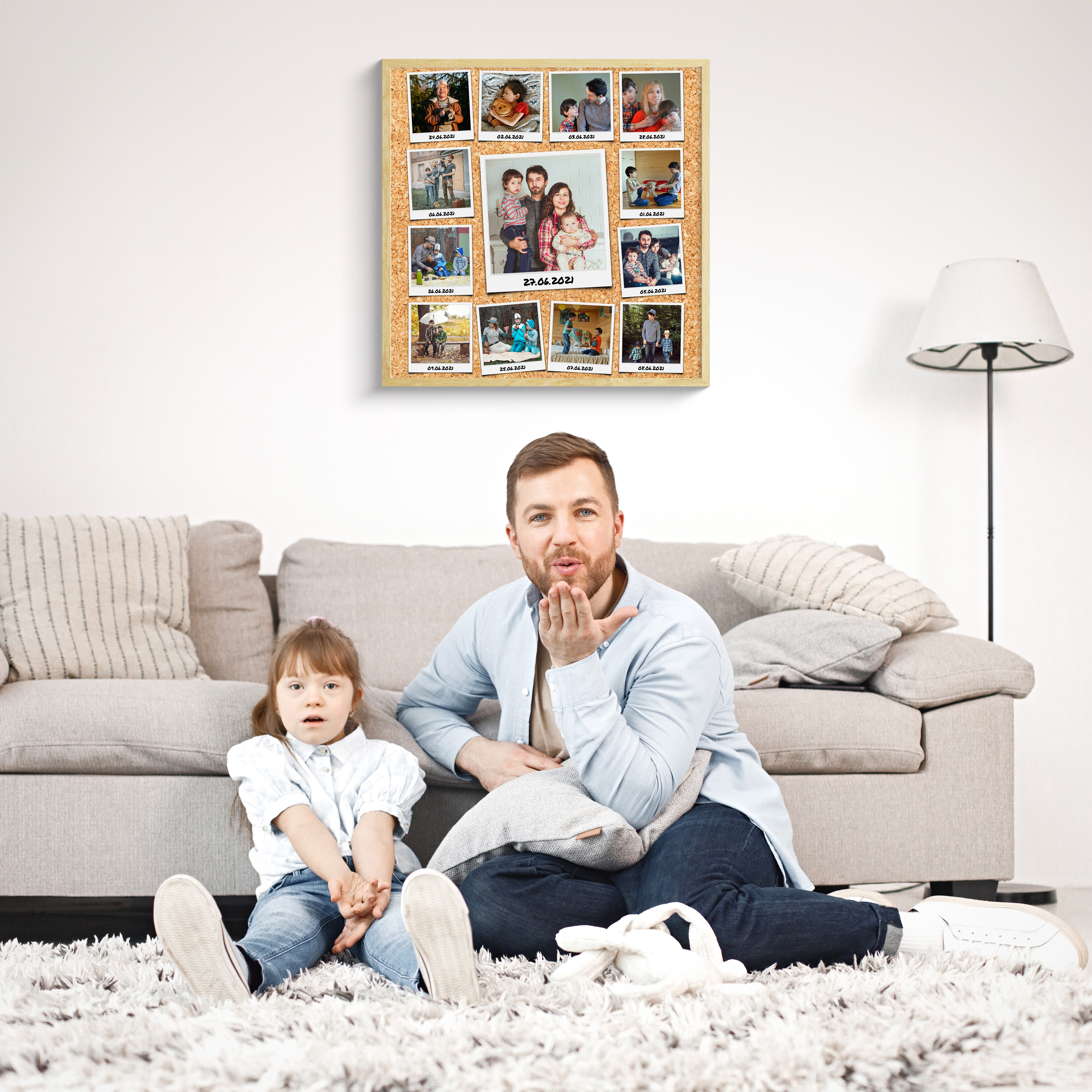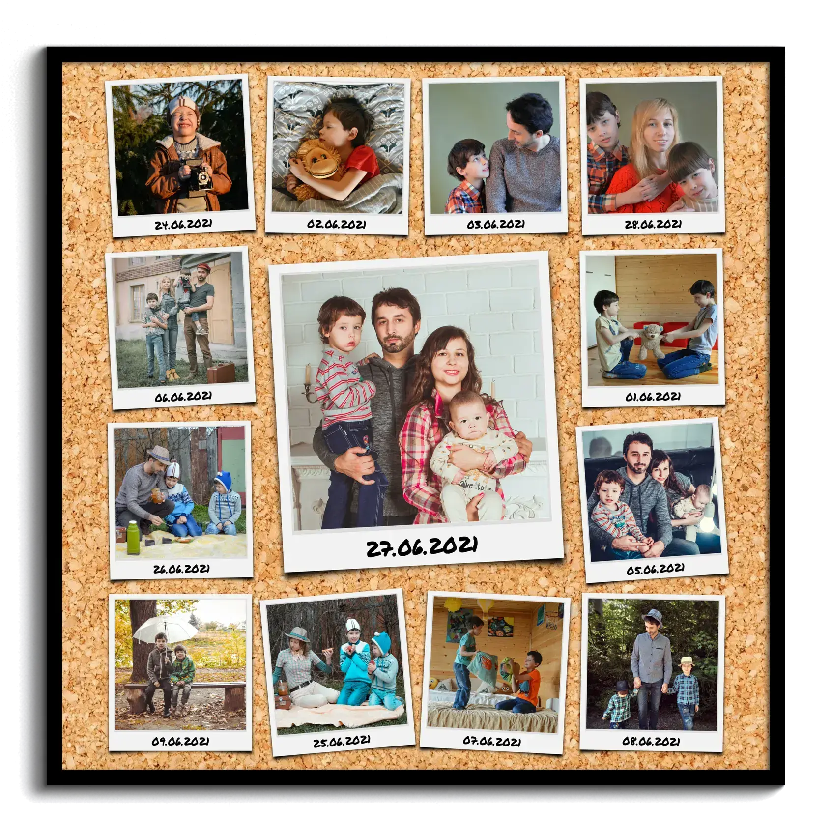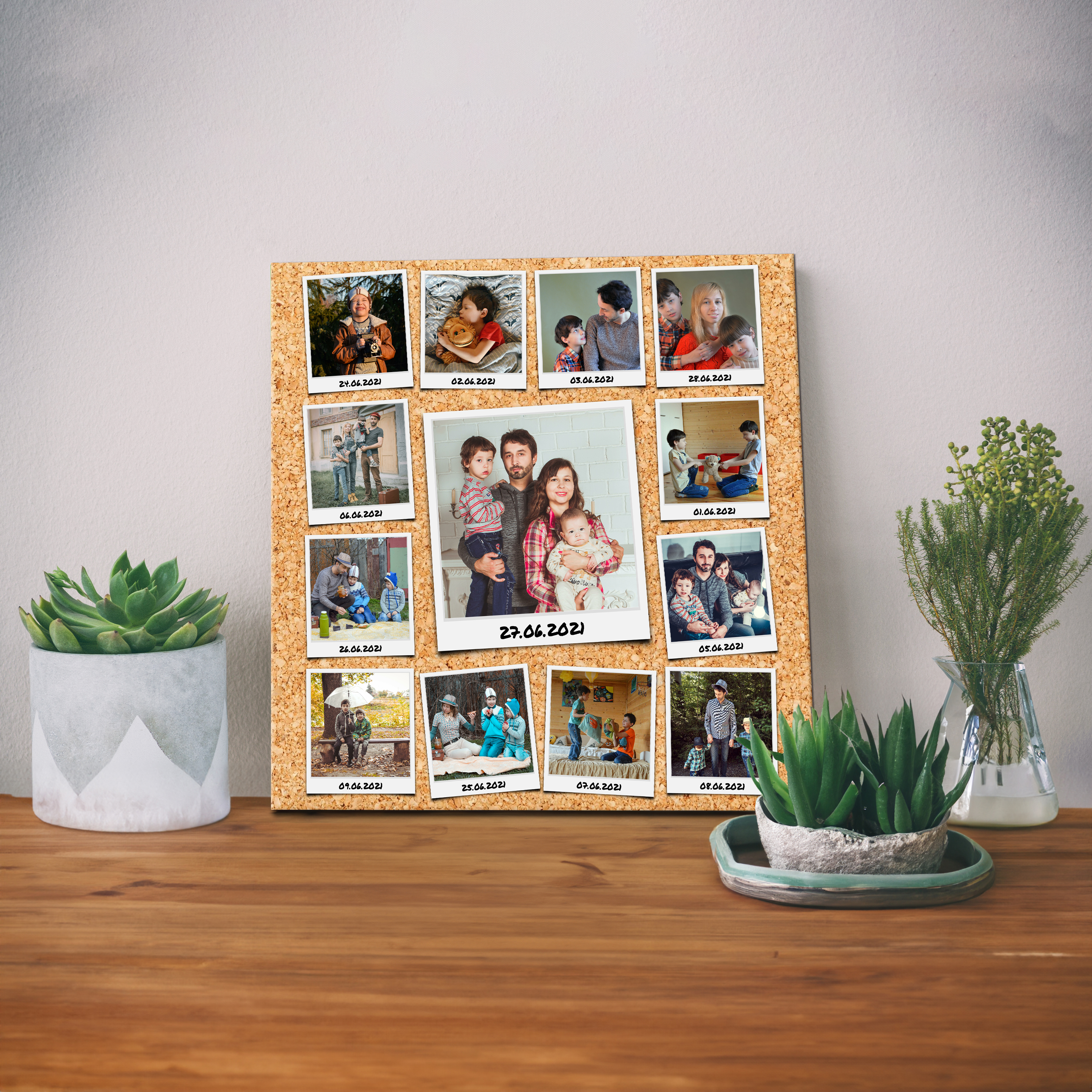 Gestalte Deine persönliche Fotocollage! Wähle eine stilvolle Vorlage, bei der Deine Fotos im Polaroid-Stil angeordnet sind. Entscheide Dich zwischen quadratisch, hochformatig oder querformatig. In der Mitte steht ein großes Bild, das von mehreren kleinen Fotos mit automatischer Datumsbeschriftung umrahmt wird, ergänzt durch einen originellen Hintergrund wie eine Korkwand. Perfekt als individuelles Geburtstagsgeschenk oder für spezielle Anlässe wie Taufen, Hochzeiten oder Einschulungen. Die Anzahl der Fotos, Texte und Hintergründe bestimmst Du ganz nach Deinen Wünschen.