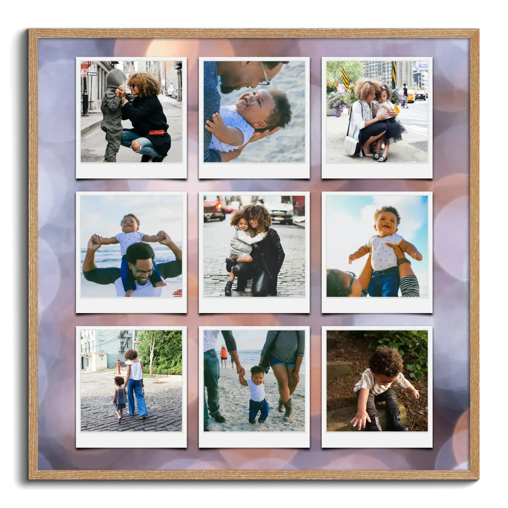 Du gestaltest frei: von klassischen Rastern über Herz- und Textvorlagen bis zu Varianten mit großen und kleinen Bildfeldern, optional im Polaroid-Stil. Passe Hintergründe, Abstände, Ränder, Schriften und Farben an, setze Überschriften und Grusstexte und wähle die Anzahl der Bilder passend zu deinem Motiv.