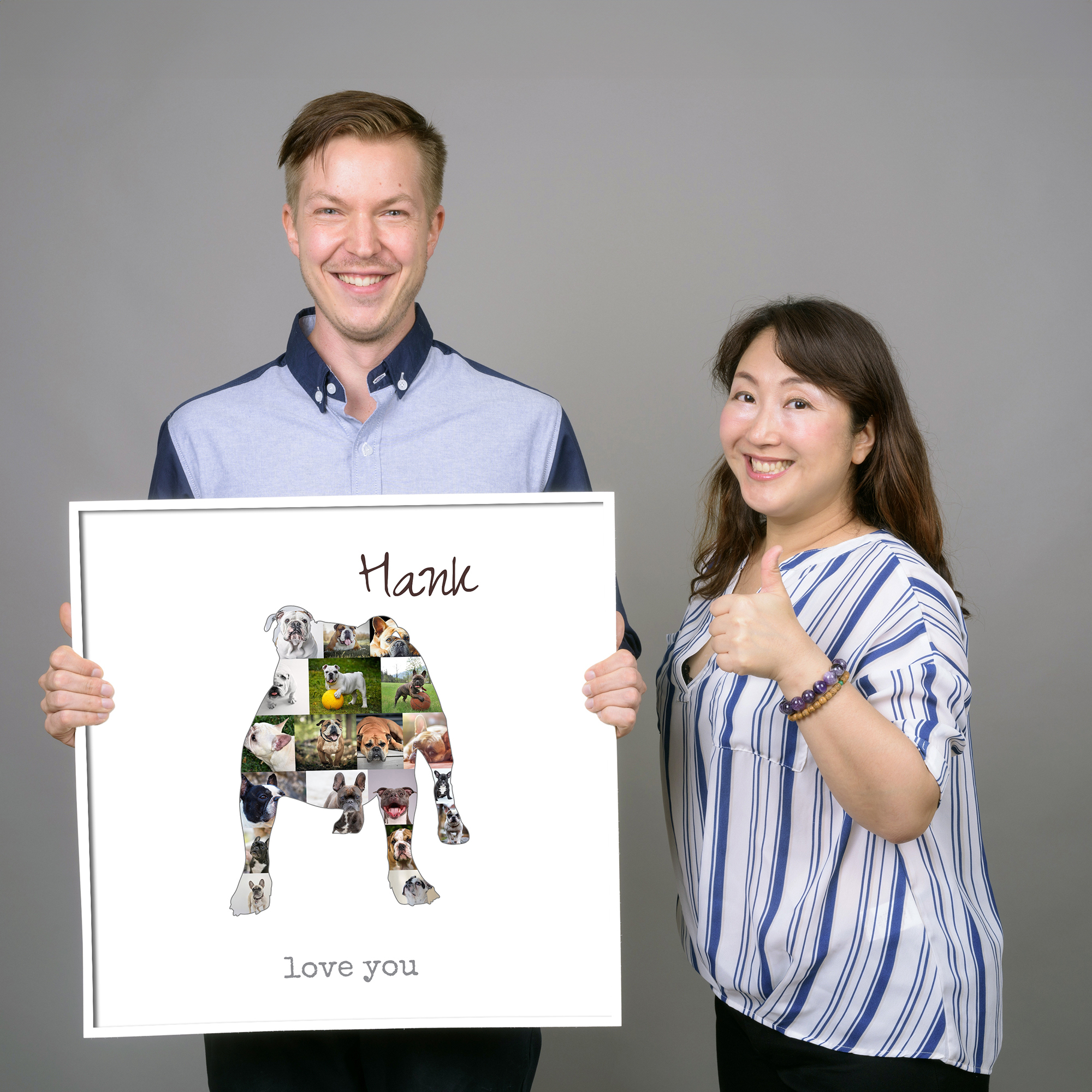Die Erstellung deiner Fotocollage ist kinderleicht. Lade einfach 15-20 deiner Lieblingsfotos hoch, ordne sie innerhalb der vorgegebenen Silhouette an und verleihe deiner Collage mit individuell hinzugefügtem Text die persönliche Note. Mit nur wenigen Klicks erstellst du ein einzigartiges Kunstwerk, das die besondere Bindung zwischen dir und deinem Hund widerspiegelt.