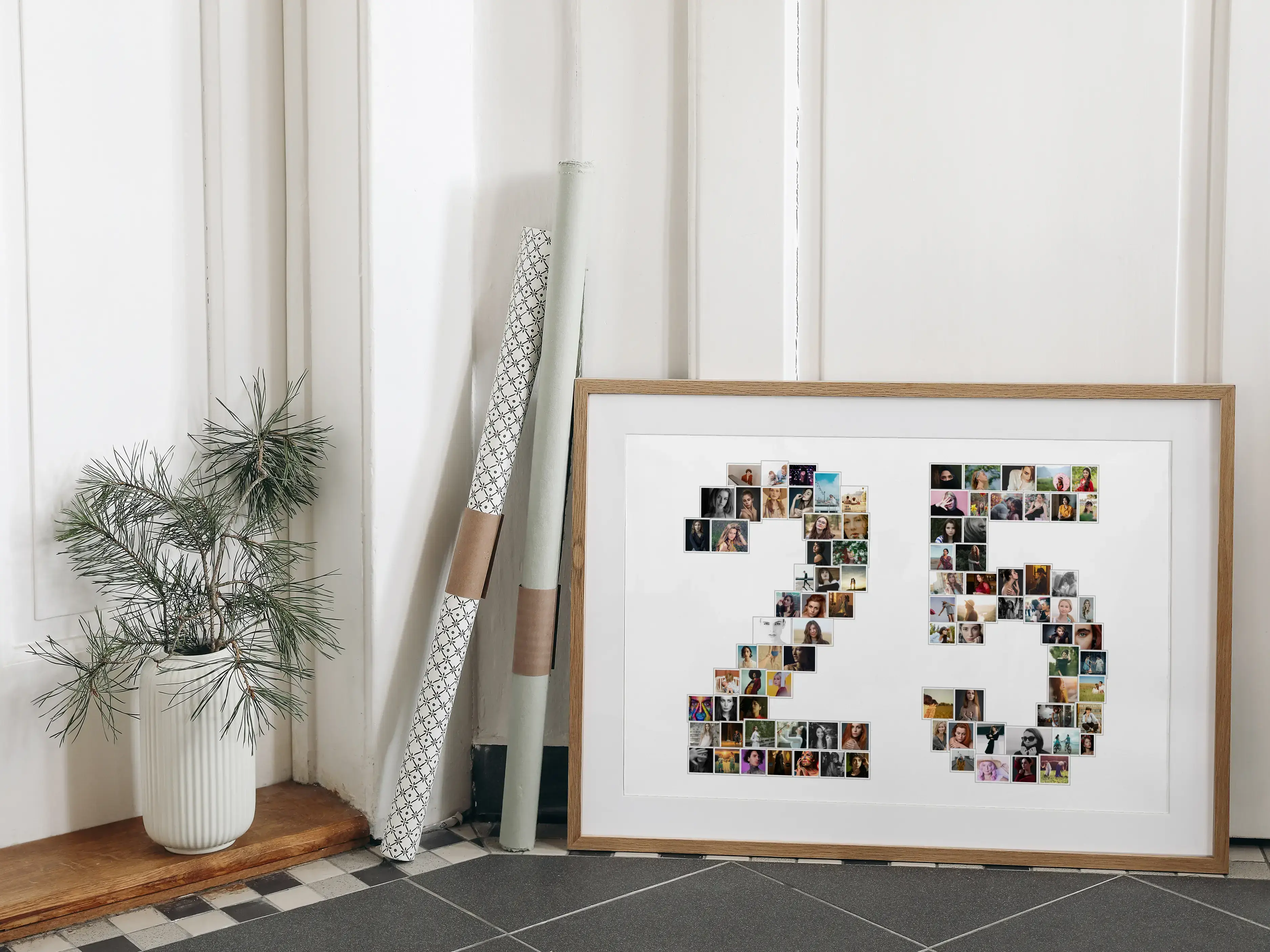 Nimm deine schönsten Fotos und forme sie zu einer einzigartigen Fotocollage! Denk zum Beispiel an die Zahl 25, zusammengesetzt aus euren unvergesslichen Momenten – eine ideale Geschenkidee zur Silberhochzeit oder einem Firmenjubiläum.