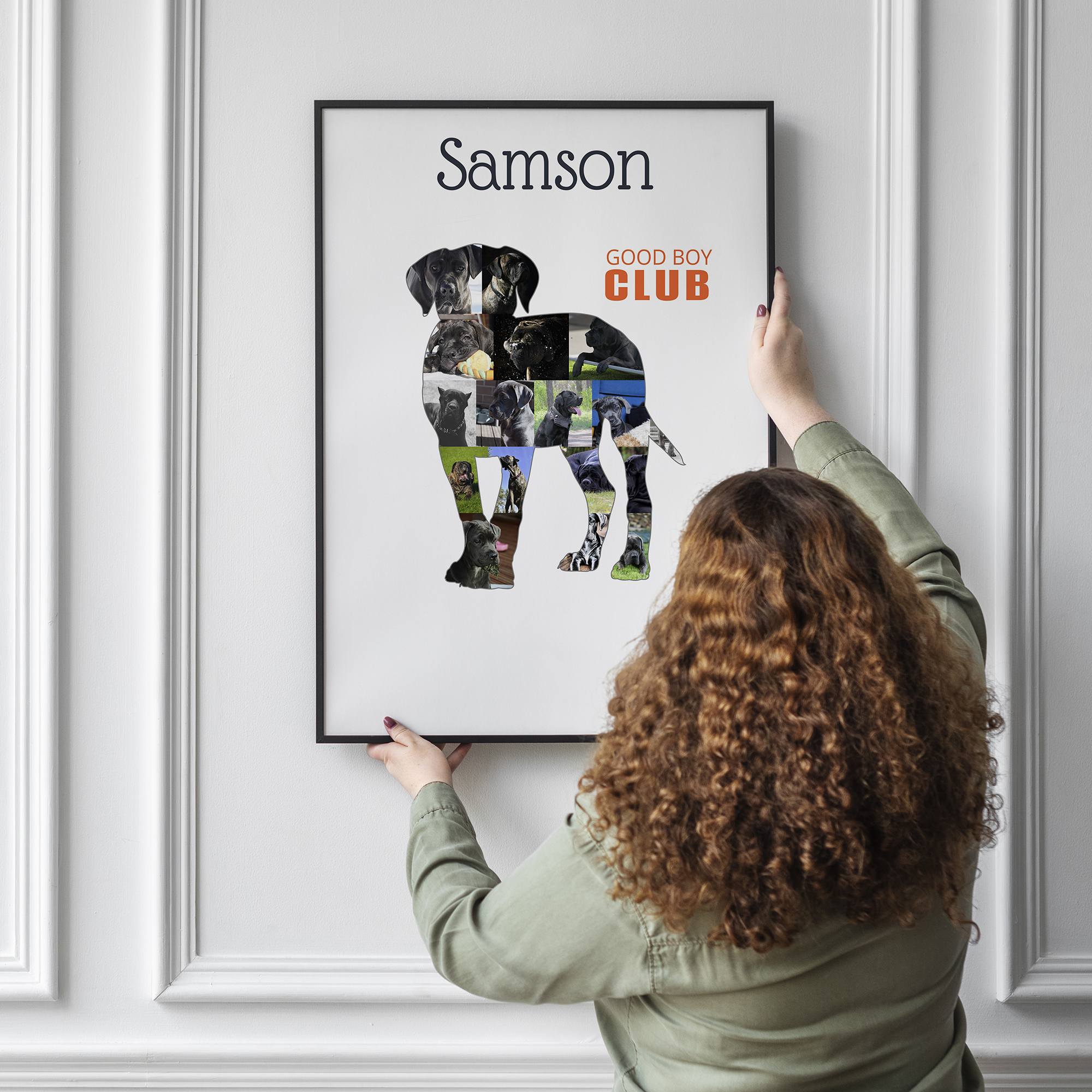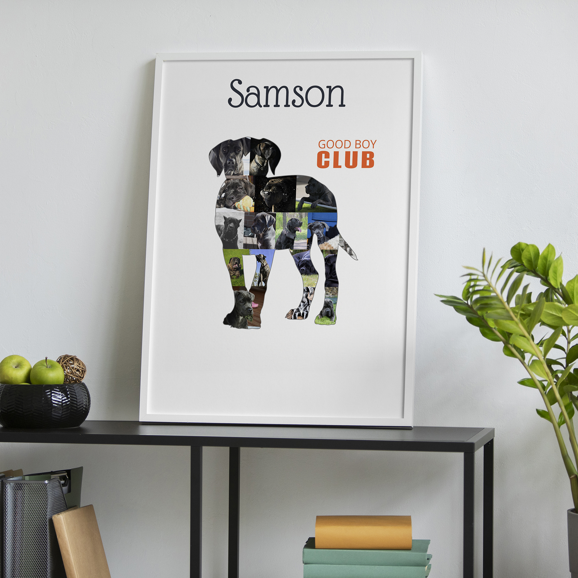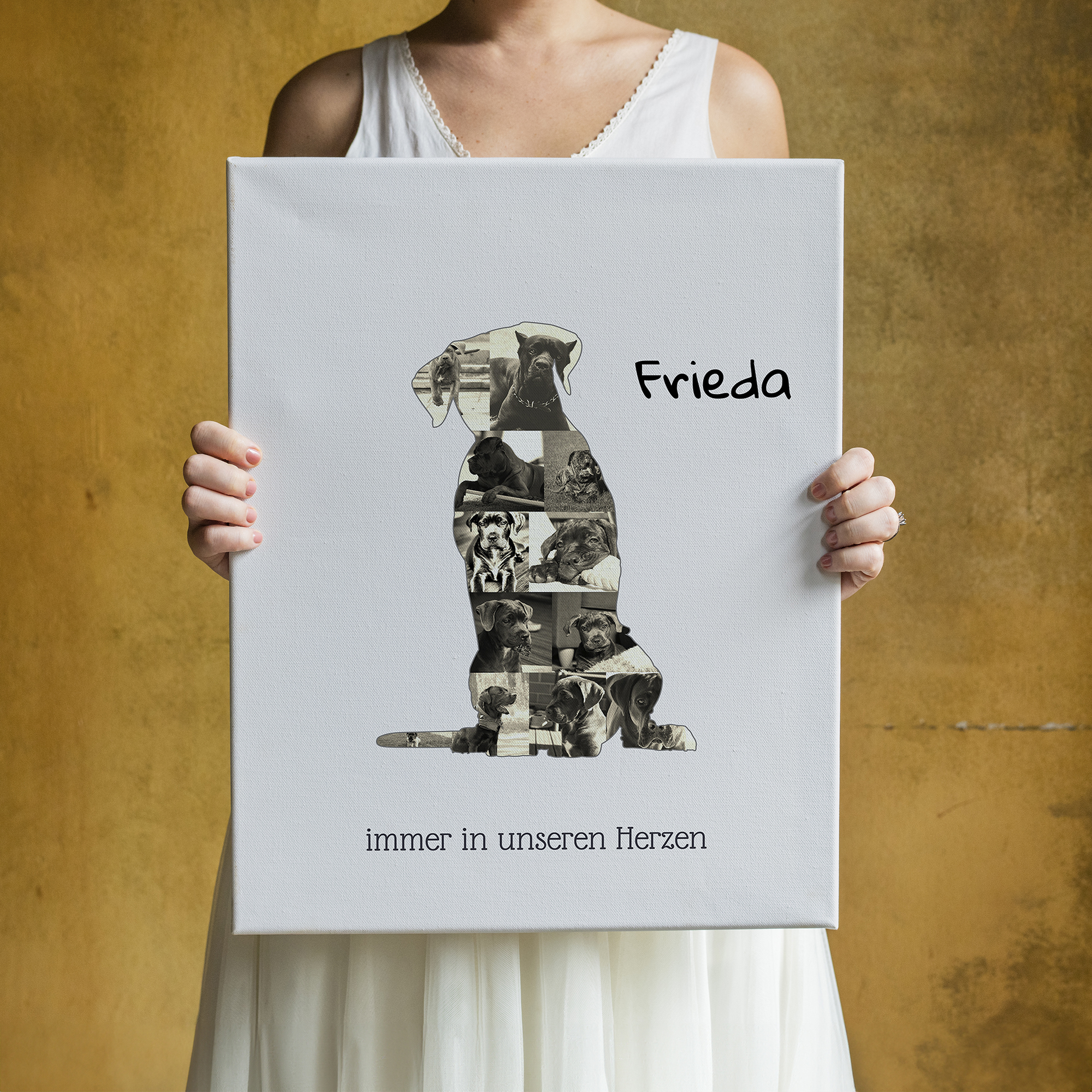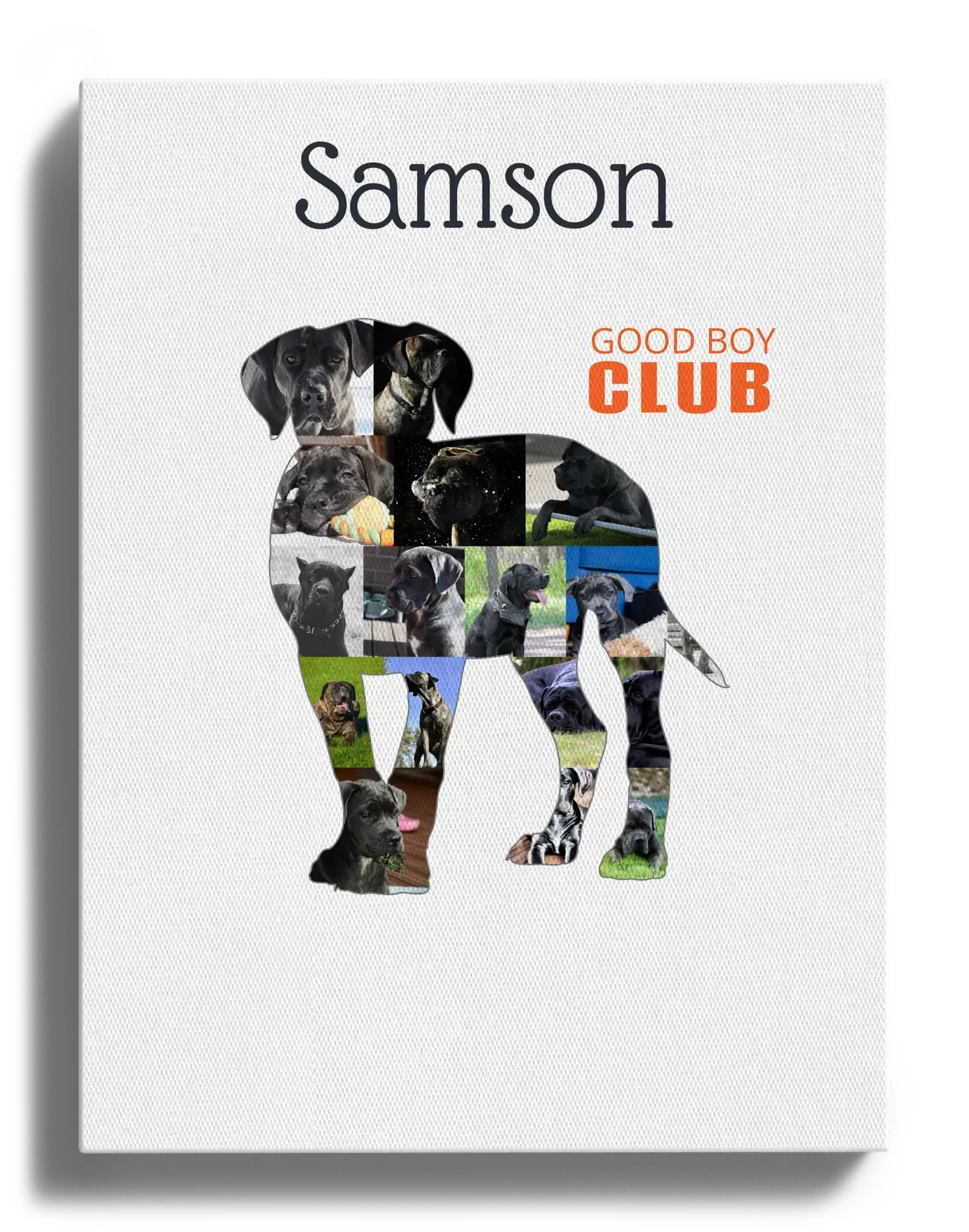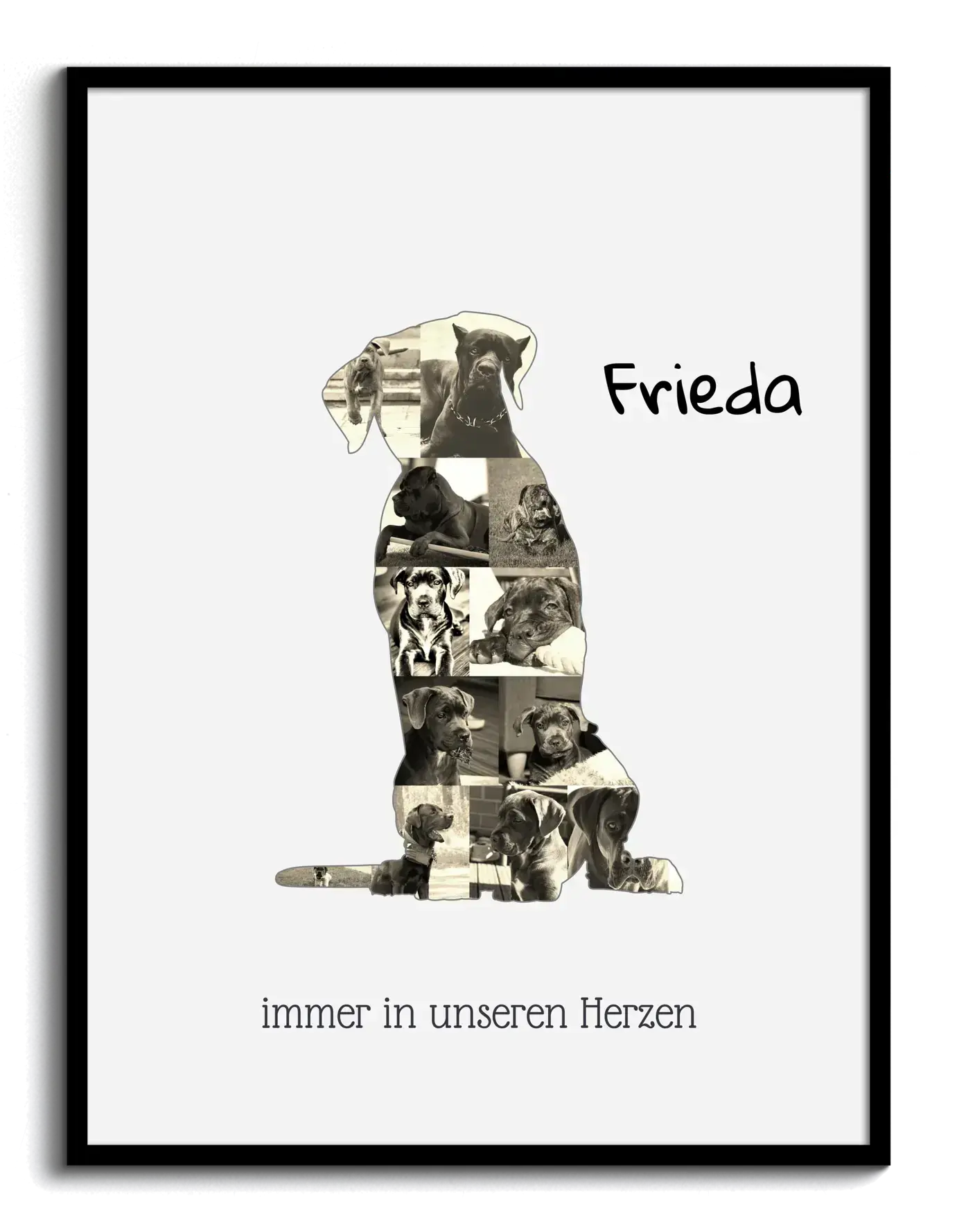 Gestalte Deine persönliche Cane Corso Fotocollage! Kreiere aus 15-20 Deiner liebsten Fotos Deine individuelle Collage im Silhouetten-Design Deines Cane Corso. Ergänze eine persönliche Botschaft und zaubere ein einzigartiges Kunstwerk.
