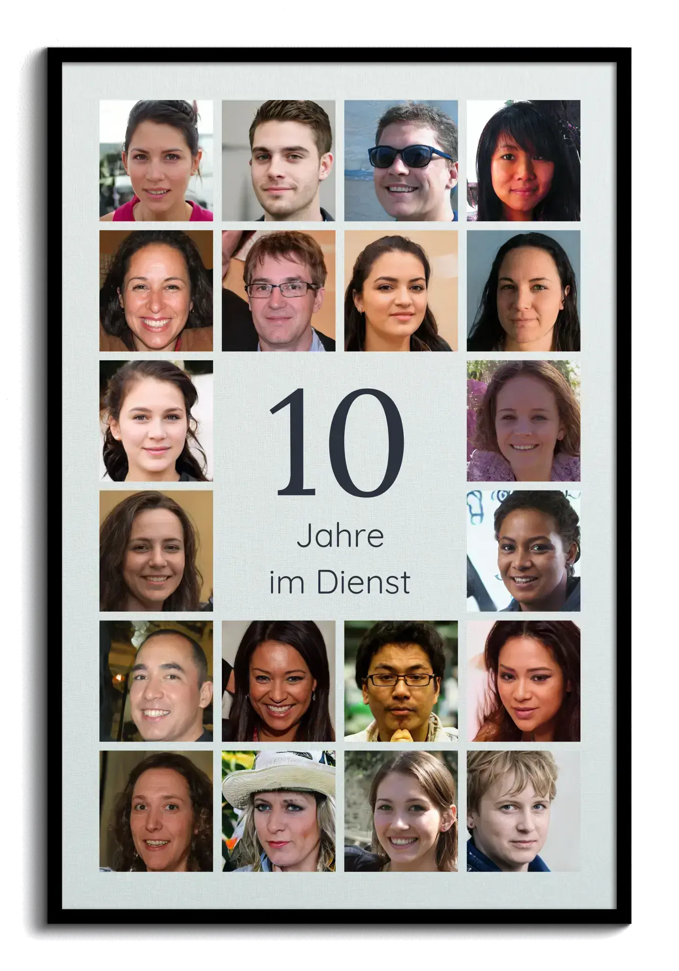 Gestalte jetzt deinen Kunstdruck und bestelle sofort. Die Jubiläums-Zahl Collage 10 zeigt eine große 10 im Zentrum, darüber den Namen und darunter einen Gruß, umrahmt von 20–80 Fotos im Raster. Perfekt fürs 10‑jährige Firmenjubiläum eines Mitarbeiters mit Teamfotos; Zahl, Texte, Farben und Format sind frei anpassbar.