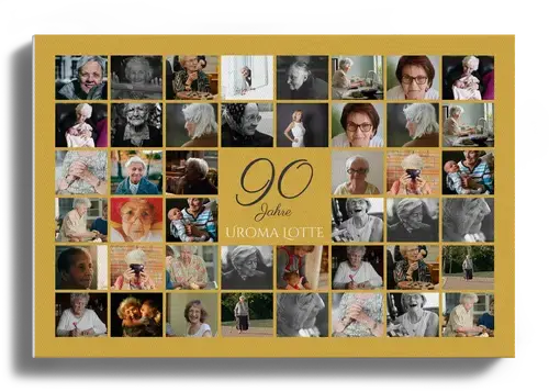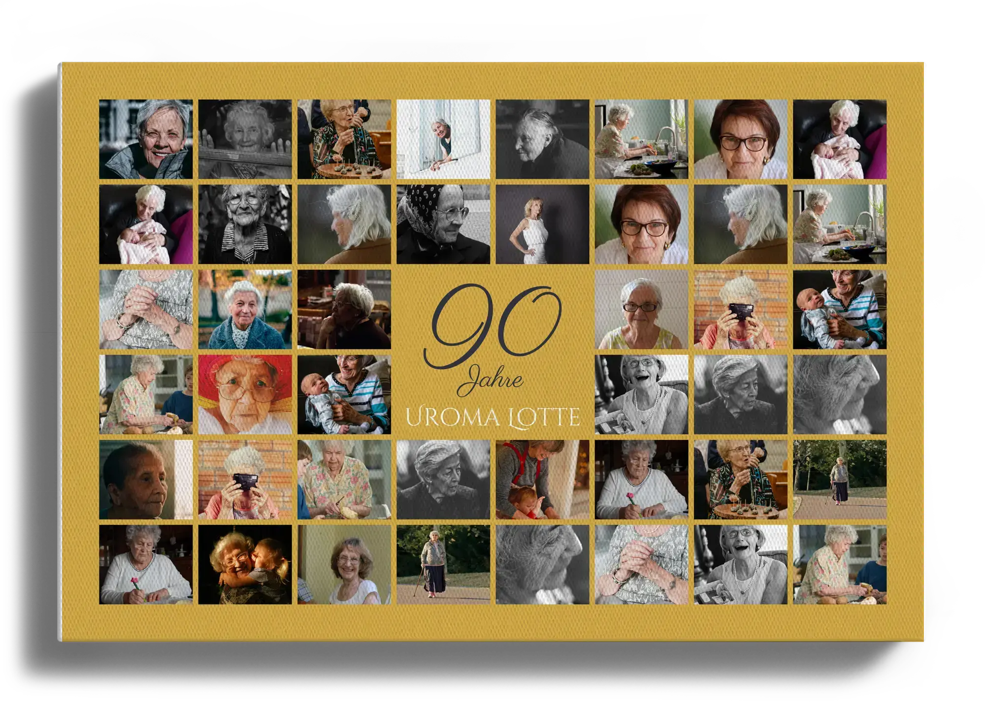 Collage 90: Zahl im Zentrum, Name/Gruß, 20–80 Fotos. Für 90. Geburtstag, Firmen-/Vereinsjubiläum.