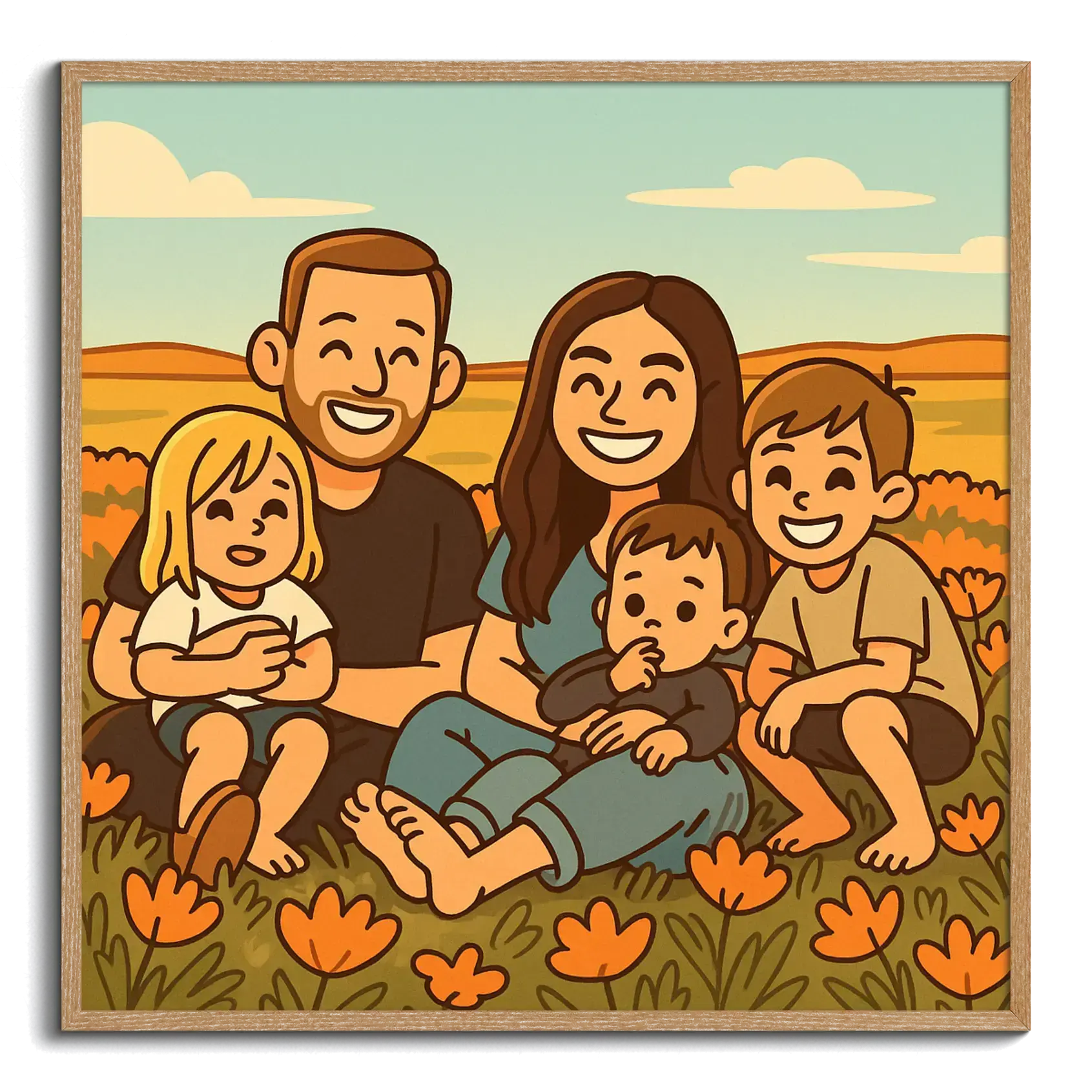 Niedriger Cartoon‑Stil mit dicken Outlines, warmen Farben und süßen vereinfachten Gesichtszügen – ohne weißen Rand.