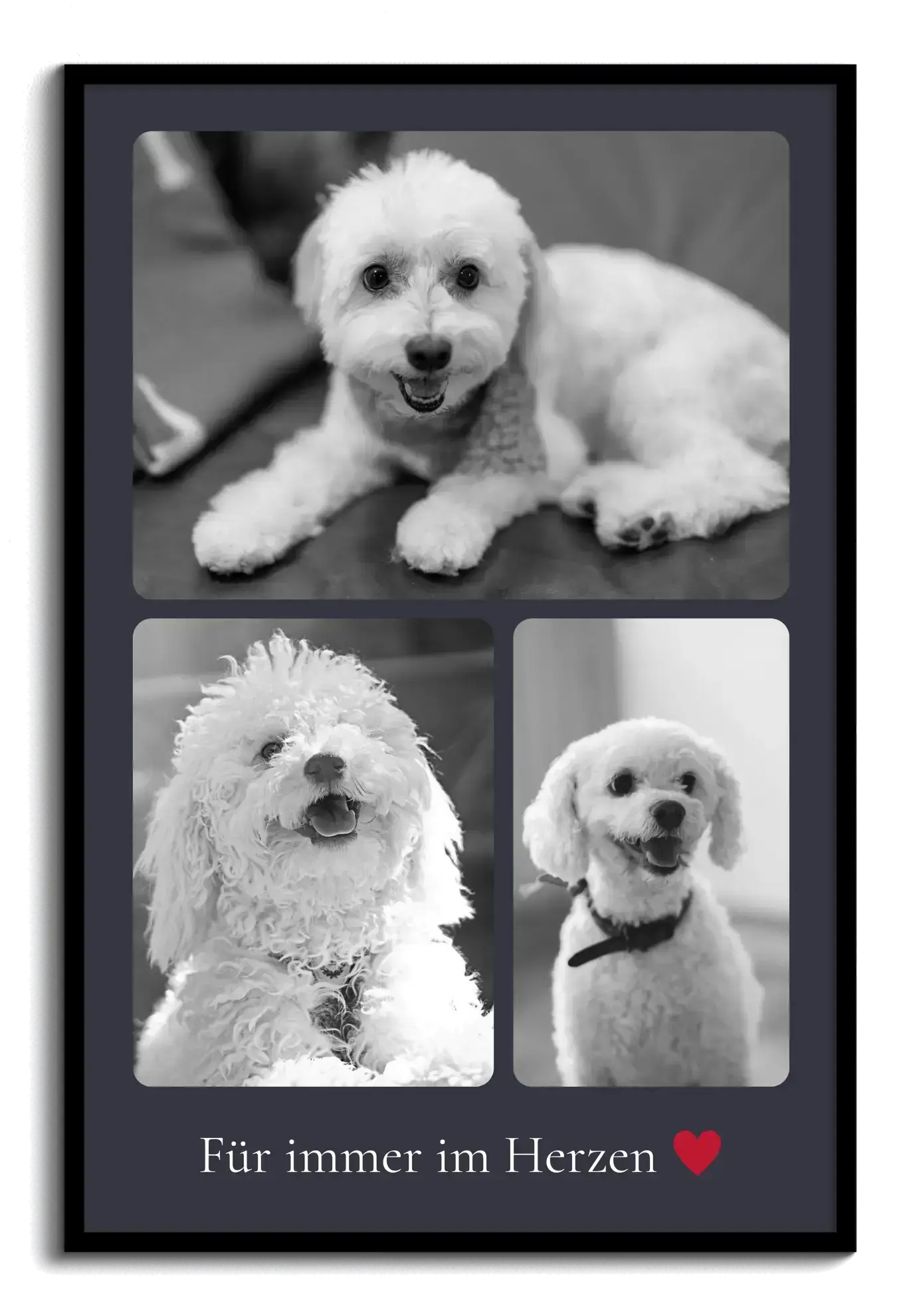 Gestalte jetzt einen liebevollen Kunstdruck zur Erinnerung an deinen Hund und bestelle sofort. In der Haustier-Trauer-Auswahl findest du Vorlagen mit mehreren großen Schwarzweißfotos, Platz für eine Widmung mit Herz-Emoji sowie individuelle Texte wie Für immer in unserem Herzen, dazu Name, Geburts- und Sterbejahr.