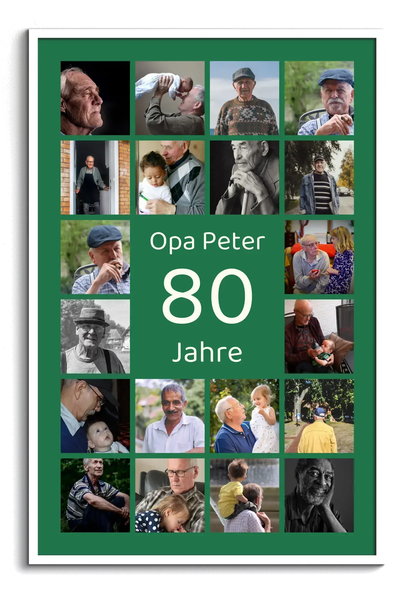 Besonders passend für den 80. Geburtstag von Oma, Opa, Eltern oder Freundinnen und Freunde, für 80 Jahre Firmengeschichte, Vereins- oder Ortsjubiläum sowie die seltene Eichenhochzeit. Als Erinnerung an Lebensstationen, Reisen, Familie und gemeinsame Erlebnisse – personalisiert mit Namen, Datum und Grußworten.