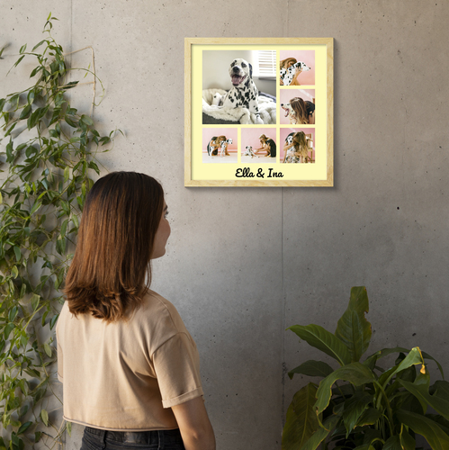 Gestalte deine eigene einzigartige Fotocollage und halte wertvolle Erinnerungen auf stilvolle Weise fest. Mit dieser quadratischen Fotocollage hast du die Möglichkeit, deine Lieblingsbilder in einem hellen und modernen Design zu präsentieren. Sechs Bilder, beispielsweise von deinem Hund, können in variierenden Größen eingefügt werden. Ein Bild rückt besonders neben einem individuellen Text in den Fokus, etwa den Namen von Hund und Besitzer, wie hier "Elle und Ina". Passe Anzahl der Bilder, Hintergrundfarben, Texte und Schriftarten nach deinem Geschmack an.
